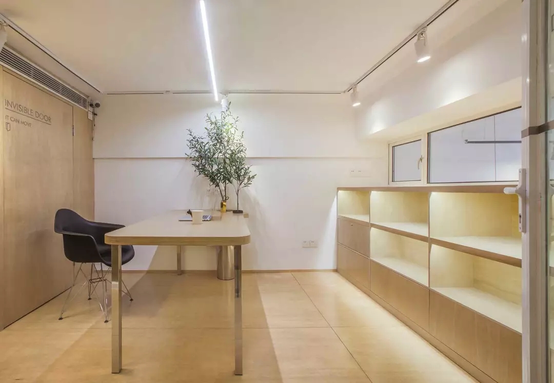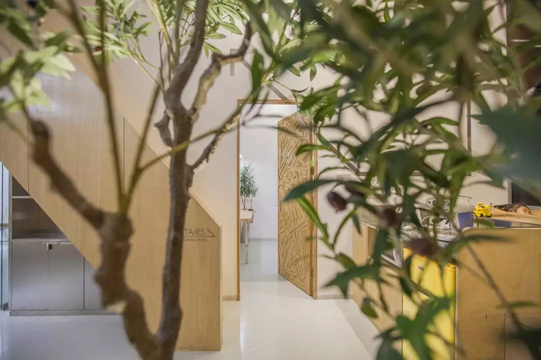 辦公桌與樹的結(jié)合,成為了整個空間的內(nèi)景觀,也與外面的綠色形成呼應(yīng),消減以往辦公的緊張氛圍。整墻的書架也不甘無趣,在實用的框架下,產(chǎn)生一絲波動的起伏,如同山崖,如同坡面。