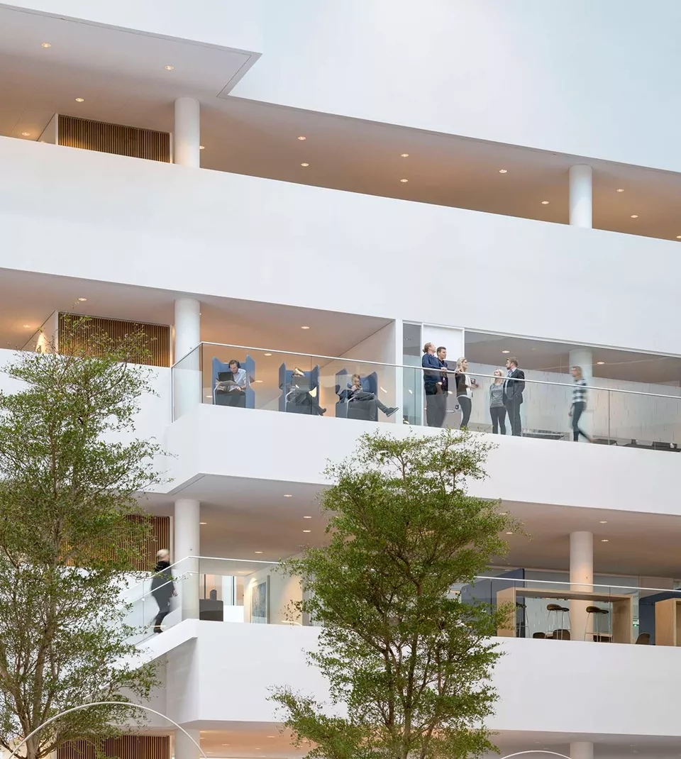 Nordea新總部擁有兩個(gè)令人難忘的中庭空間。其中一間為斯堪的納維亞半島最大的交易大廳,可容納 600名交易員,并可以觀賞到AmagerFælled的自然風(fēng)光。而另一間中庭則成為了客戶與員工之間的互動(dòng)場(chǎng)所。兩個(gè)中庭的區(qū)域讓建筑變得開放自由,如同城市中的公共空間,人們?cè)谶@里相遇、共進(jìn)午餐以及參加非正式會(huì)議,同時(shí)也是各個(gè)部門開展內(nèi)部活動(dòng)的好地方。