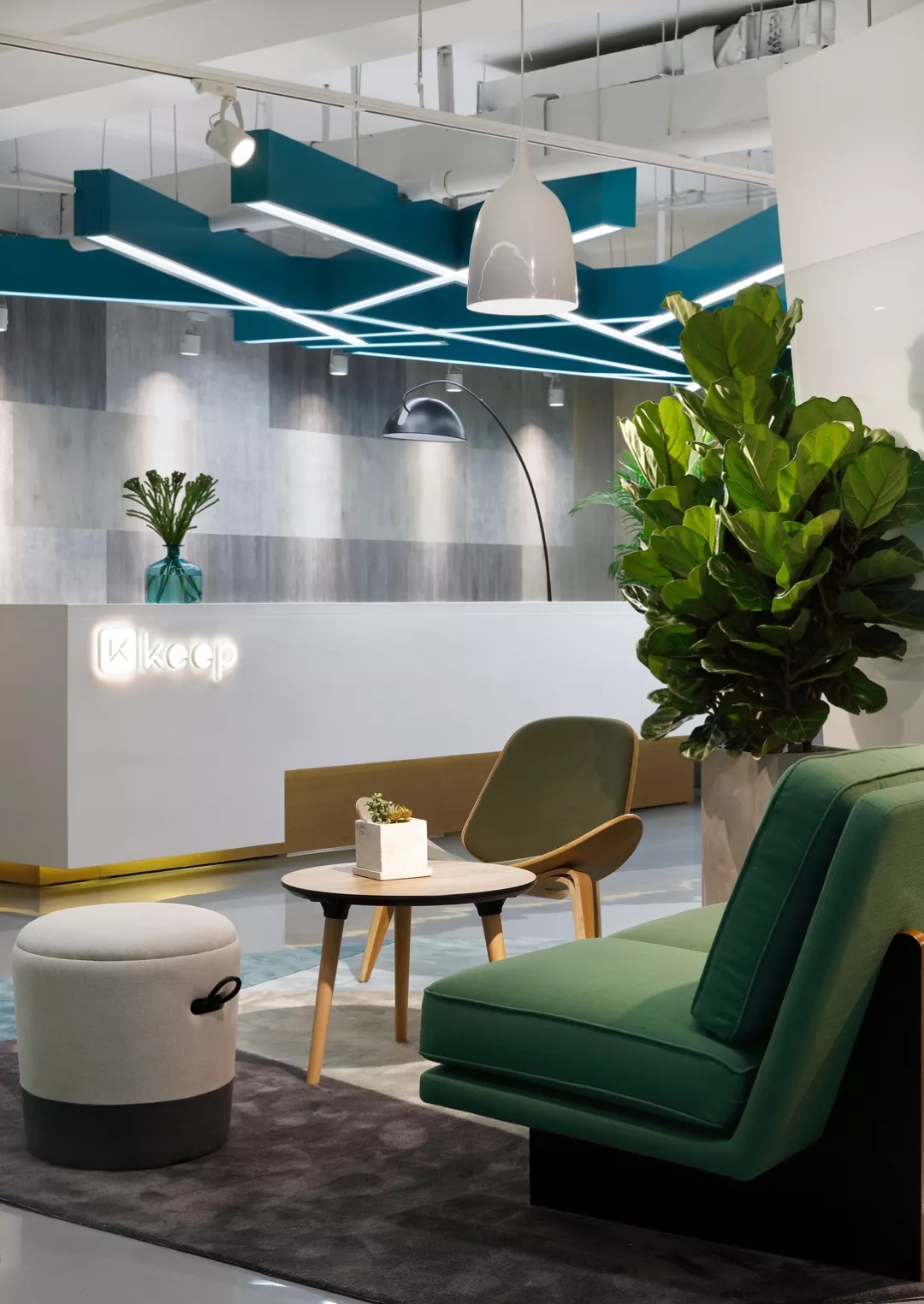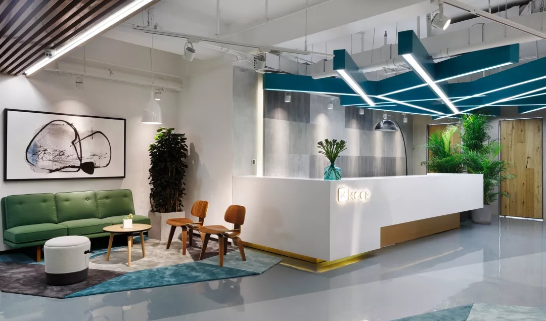 靠近電梯入口的前臺通過頂部的放射狀線條設(shè)計(jì)產(chǎn)生視覺延伸感,兩側(cè)區(qū)域通過軟裝陳設(shè)實(shí)現(xiàn)多層次的空間,靈活滿足接待、等候、會議及咖啡茶點(diǎn)的各種需求,員工和來訪人員各取所需互不干擾。
