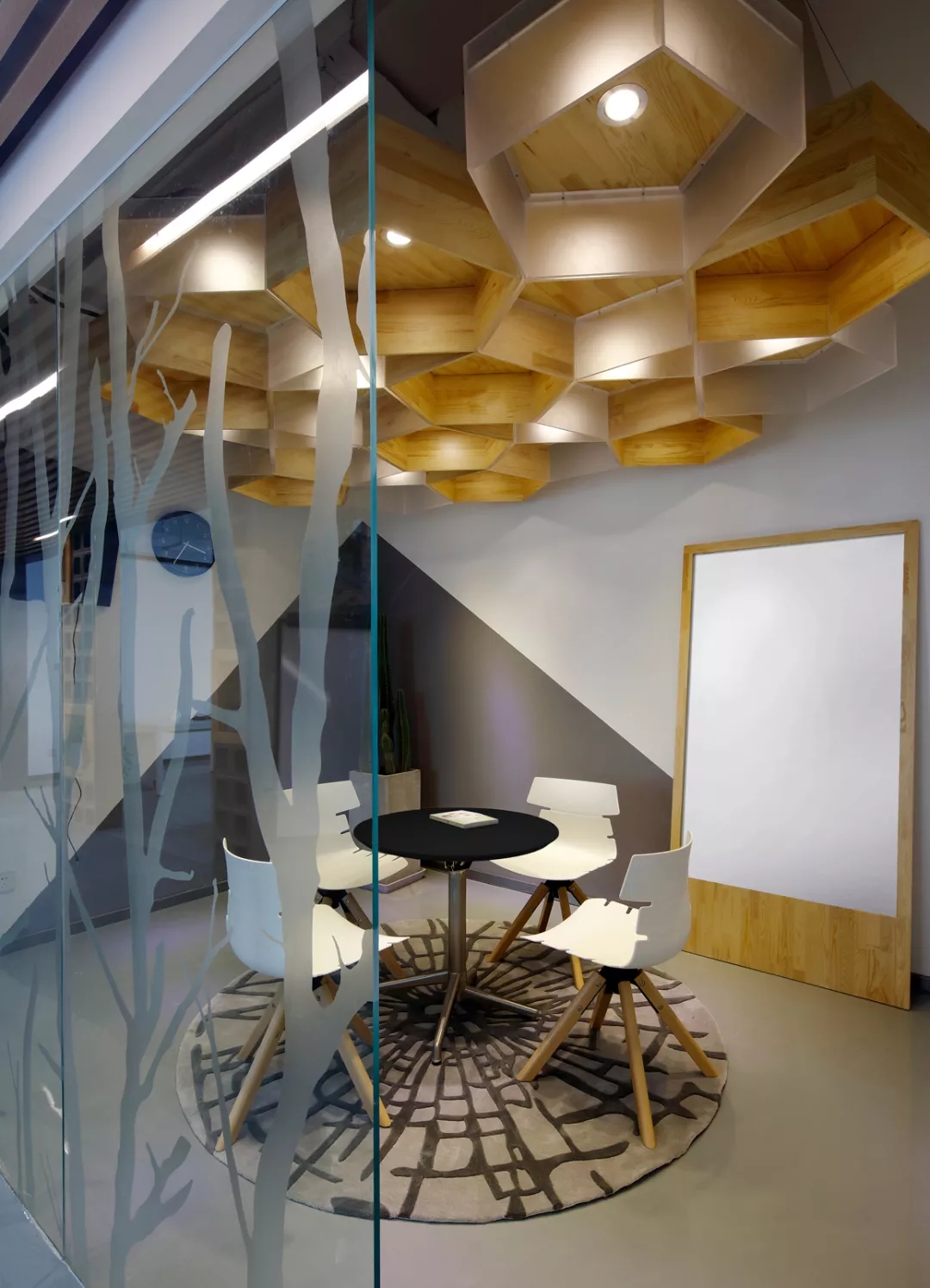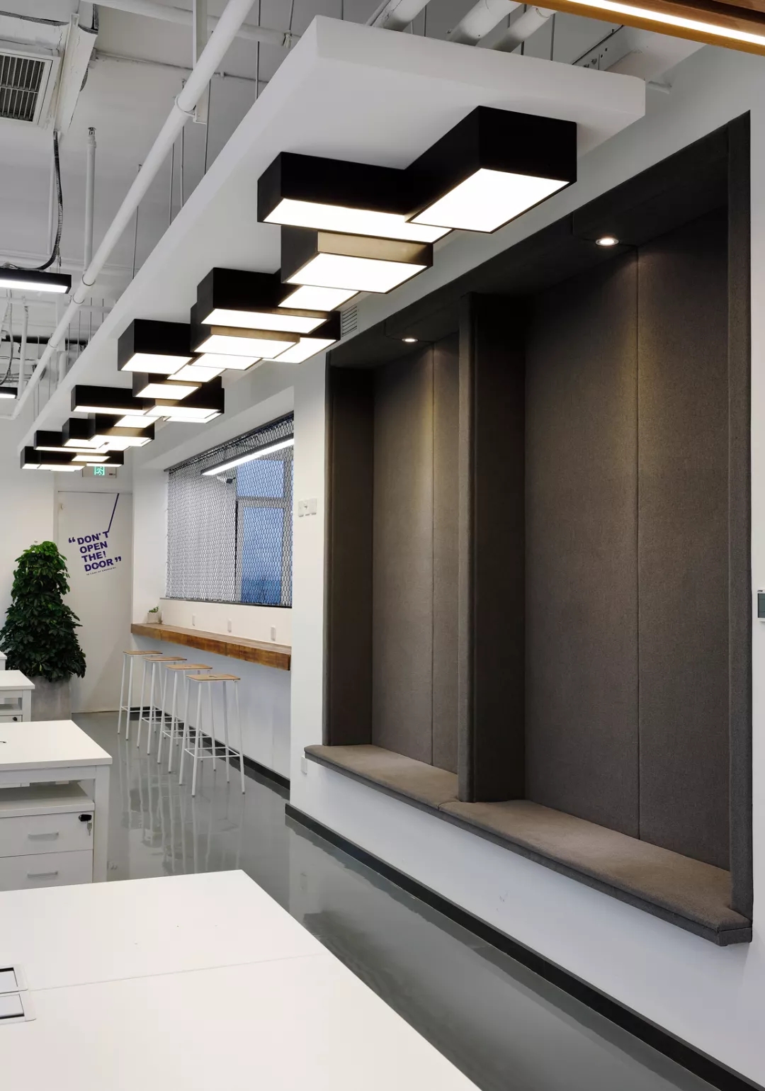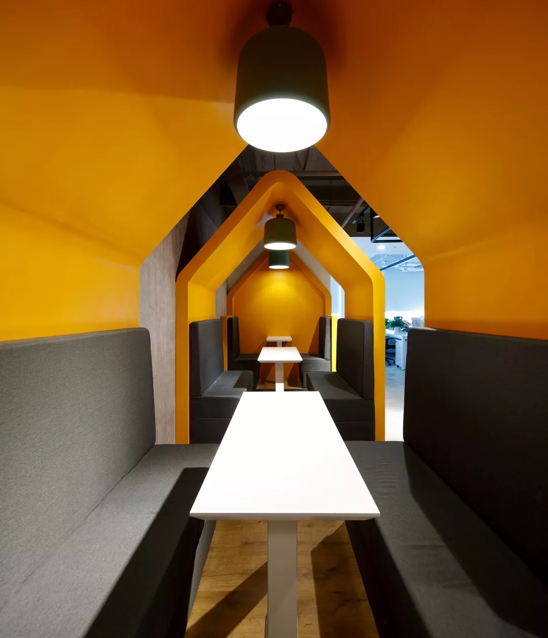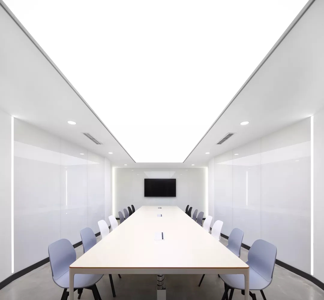 最新完成的整層辦公區(qū)延續(xù)了主體風(fēng)格,少了花俏的點(diǎn)綴,更多地使用色彩碰撞來提振精神,比如亮橙色開放會議間與品牌VI的臟灰色搭配。也首次嘗試了全白色調(diào)的通透會議室,算是對極致風(fēng)格的小探索。