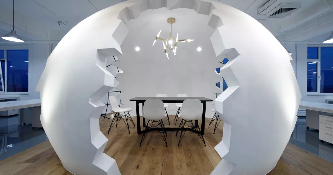 為了給開放式的辦公空間注入活力,我們在排排坐的工位場地正中設(shè)置了“破殼而出“的主形象——巨蛋討論區(qū),橢圓形的蛋壁實(shí)現(xiàn)攏音的隔音效果,兩側(cè)的鏤空引入自然光源,令這個(gè)裝置藝術(shù)般的討論區(qū)打破開放式工位的沉悶,成為視覺焦點(diǎn)。