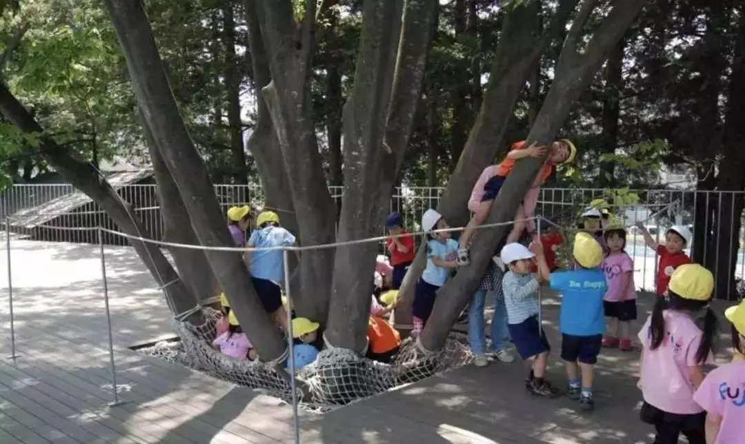 為了鼓勵孩子攀爬和探索自然的本能, 樹的周圍拉上了網。也就是這么個簡單的網,讓孩子們樂趣無窮,他們非常喜歡往這個網里鉆......有時候,一棵樹的網可以兜住40個小孩。