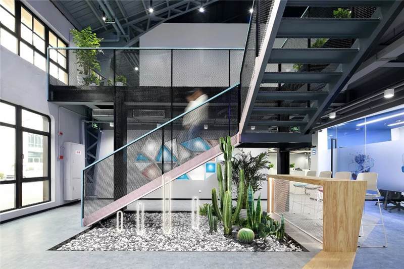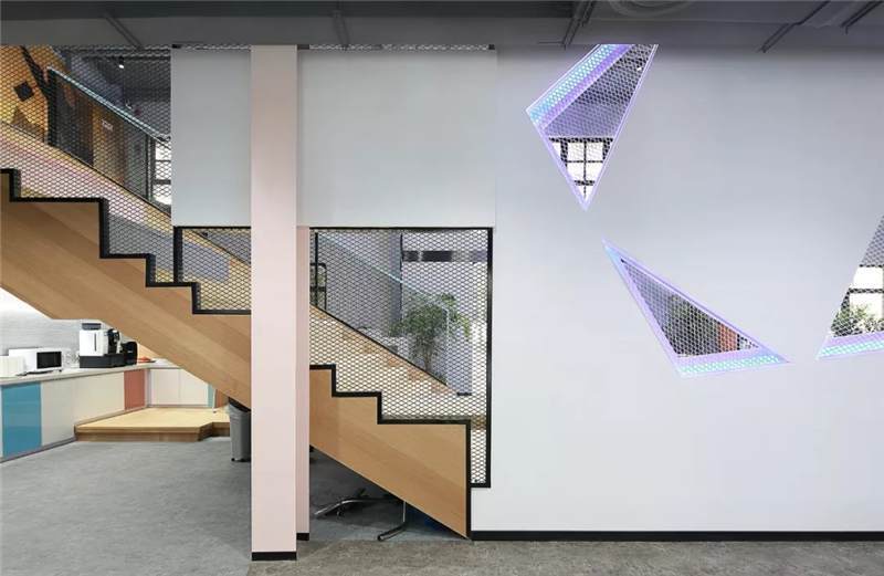 前廳區(qū)右側(cè),是直通二樓的木飾面步梯,臺階加寬,高度錯落有致,LOGO藍(lán),粉,灰與原木色相間,這不僅僅是上下樓梯,更承載著員工的休憩與溝通交流功能,因此增強該區(qū)域的趣味性。步梯后方和右側(cè)吧臺巧妙的設(shè)計成一個連貫性的茶水區(qū),吧臺錯落在茶水柜延伸出的區(qū)域,搭配綠植,增添生機和活力。