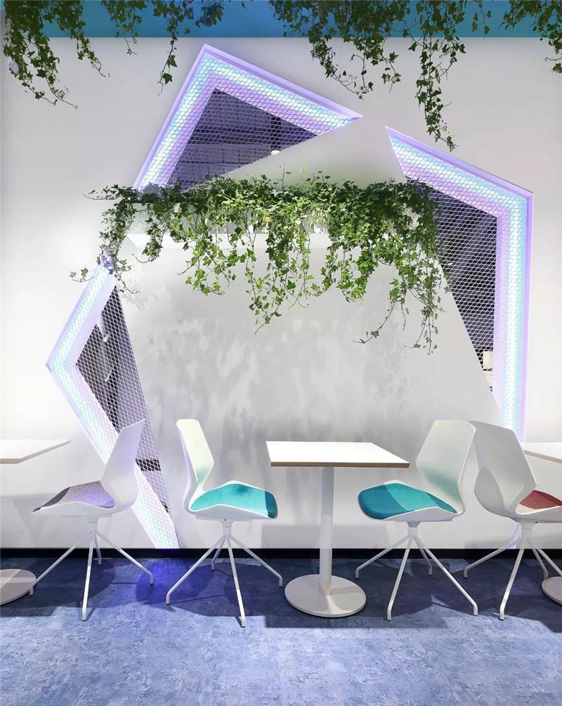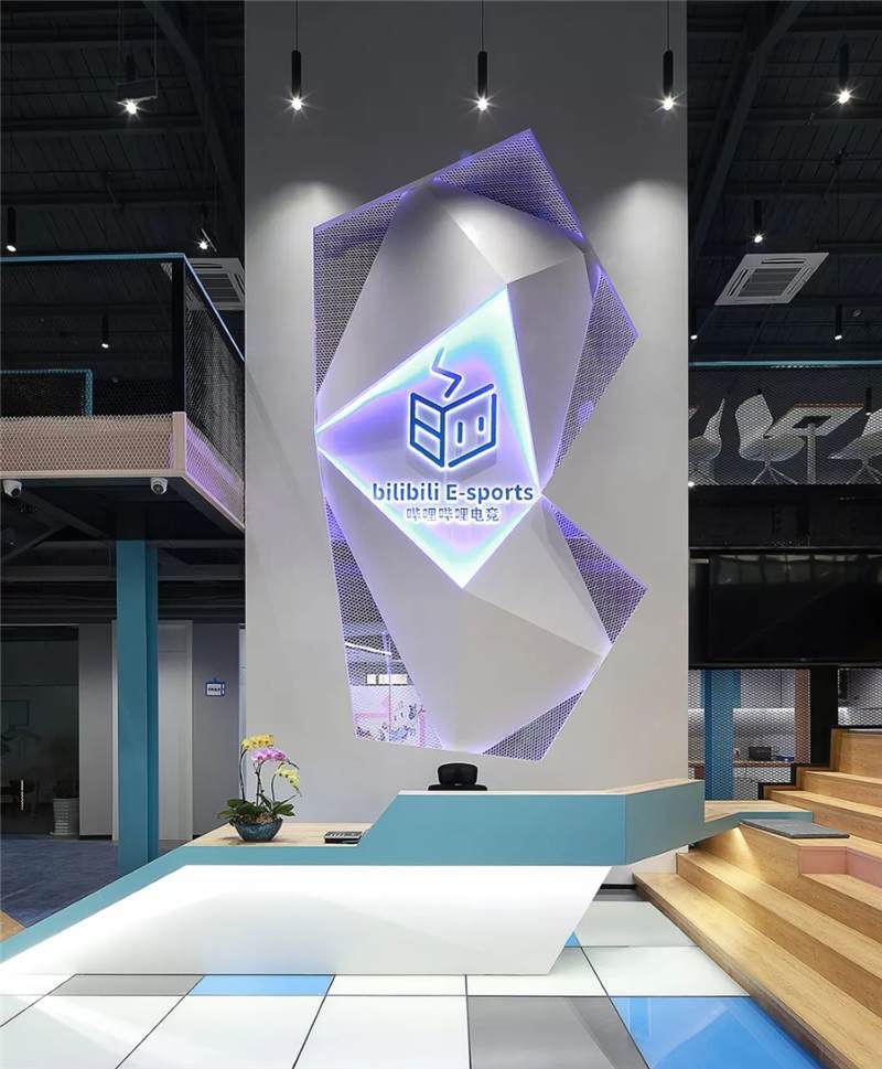 前臺接待區(qū)利用建筑結(jié)構(gòu)挑空空間的優(yōu)勢,塑造9米高的具有未來雕塑造型藝術(shù)感的LOGO背景墻,結(jié)構(gòu)形態(tài)上,設(shè)計師運用B站文化中的創(chuàng)意與元素,中間由三維立體幾何造型與鐵絲網(wǎng)拼接而成,配以藍(lán)色燈光,彰顯公司文化的同時呈現(xiàn)電競的科技感,使得整體背景墻,體量和形態(tài)上給往來訪客和員工強烈的視覺沖擊感。