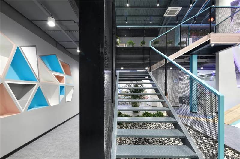 前廳左側(cè),設(shè)計結(jié)構(gòu)簡單的樓梯,運用與二層欄桿材質(zhì)相同的鐵絲網(wǎng)扶手,使得兩層樓形成一個工業(yè)風(fēng)的整體。側(cè)邊與扶手點綴以藍(lán)色和粉色的噴漆,樓梯下布置用鵝卵石,仙人掌和燈光組成的景觀裝置小品,讓整個電競空間生機勃勃,平添許多年輕活躍的氛圍。此處木飾面的吧臺延伸到地面再與前臺、右側(cè)大臺階連接形成一個整體,使整個空間更加連貫統(tǒng)一。