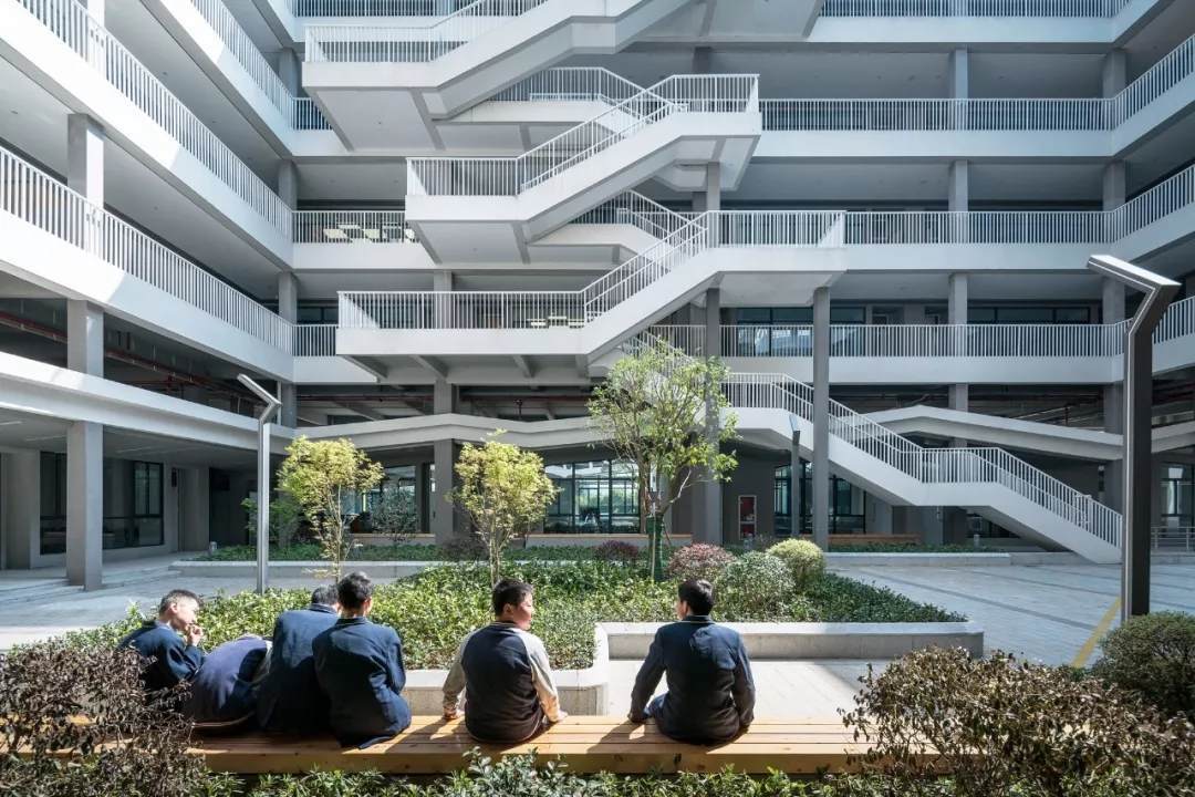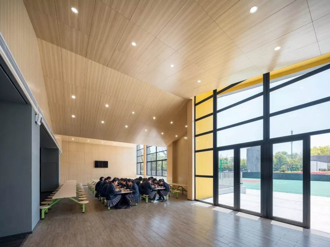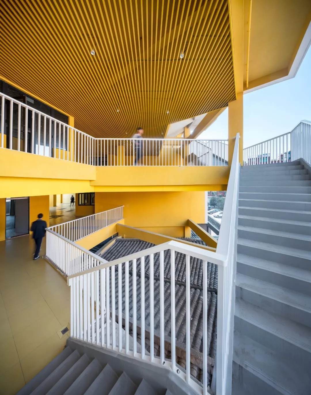 校園首層裙房的折面屋頂鋪滿了小青瓦,是中國傳統(tǒng)建筑中最常見的一種材料之一。從上層建筑向外眺望就可以看到,瓦片不僅起到建筑屋面保溫防水的作用,還為整個校園帶來了一份優(yōu)雅和淡然。