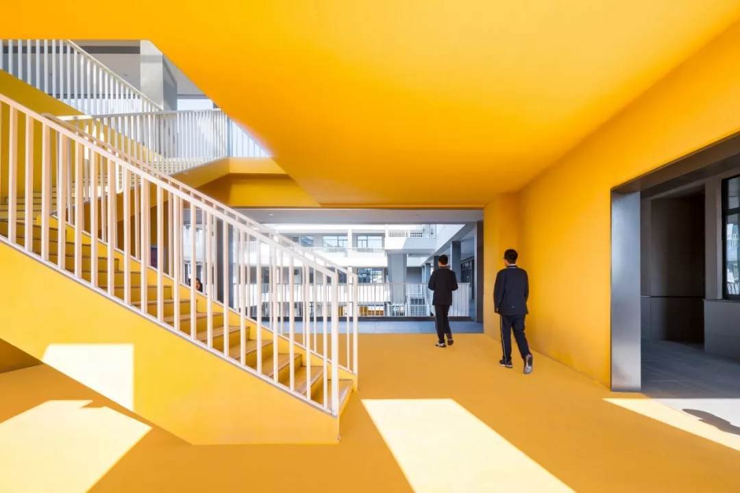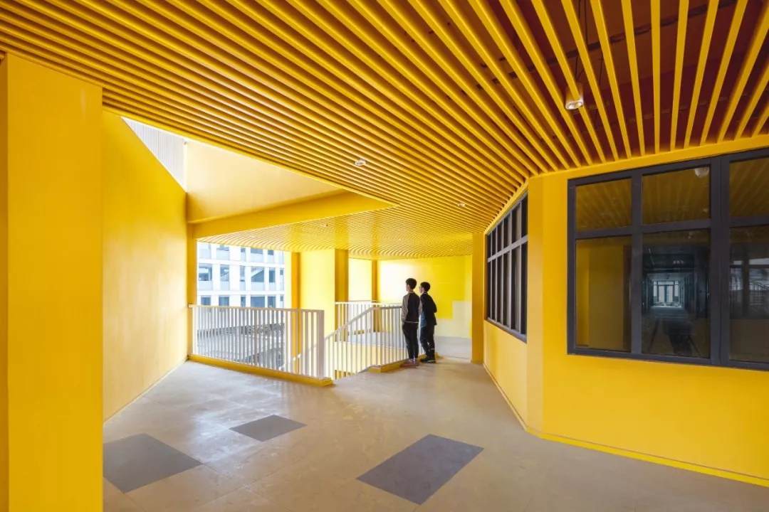 此外,設(shè)計(jì)在教室與地面集中活動場地之間創(chuàng)造了中間層級的活動場地,讓課間短暫的時間也能讓學(xué)生充分玩耍。把教學(xué)樓和宿舍樓局部的體塊掏空形成半開放的活動空間,將掏空與開洞這種二維的建筑元素增加了一維,表面上看是把原有的實(shí)體空間減少了一部分,實(shí)則掏空的部分成為了學(xué)生課外活動、接觸自然的場所,增加了整體空間的豐富程度,反而達(dá)到了100-1=101的效果。并且,活動空間被設(shè)計(jì)為統(tǒng)一的明黃色,配合午間陽光的光影效果,為校園增添活力的同時增強(qiáng)辨識度與歸屬感,促進(jìn)學(xué)生們的溝通交流。