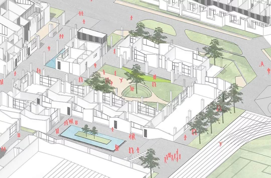 為此,校園中的教育活動場所不應(yīng)僅著眼于教室,而是以城市規(guī)劃的視野作為出發(fā)點(diǎn)。校園首層的建筑形態(tài)以當(dāng)?shù)亟纤l(xiāng)的坡屋頂建筑為原型進(jìn)行排列組合,并置入了“街道”、“巷弄”、“院子”、“口袋公園”等有趣友好的場所,強(qiáng)化校園的“社區(qū)感”,“大街小巷”之間互相連通,并連接著一個個小而美、小而親的場所,生態(tài)開放,恬靜安逸,為孩子們帶來“浸潤式”的教學(xué)空間體驗(yàn),引發(fā)孩子們互動玩耍、學(xué)習(xí)交流的熱情。