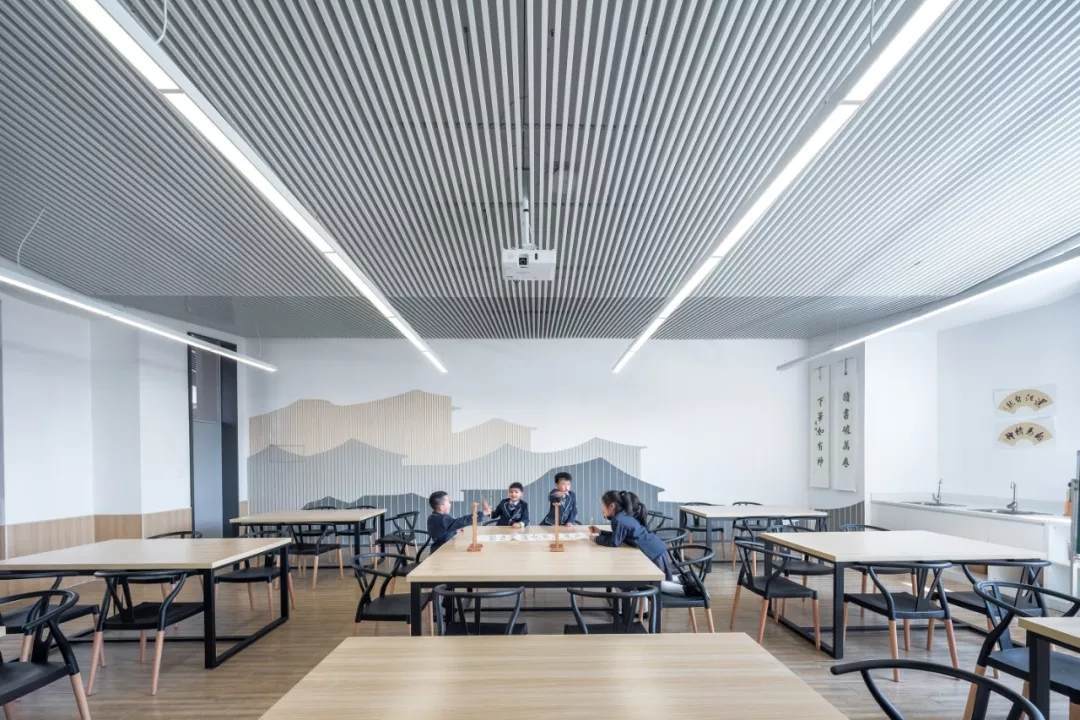 與此同時,為了整體打造校園環(huán)境,設(shè)計(jì)從空間結(jié)構(gòu)、人造物與自然物的角度出發(fā),將建筑、室內(nèi)和景觀融合在一起,達(dá)到一種“浸潤式”的教學(xué)空間體驗(yàn)。