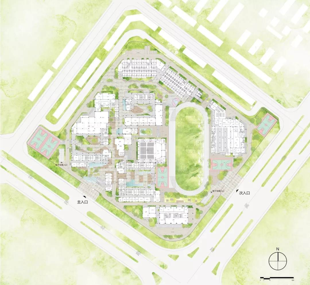 整個校園場地是一個呈45度朝向的矩形,建筑密度達(dá)到1.4,遠(yuǎn)超0.8的平均標(biāo)準(zhǔn),場地空間利用非常緊張。如此高密度環(huán)境下的校園建筑規(guī)劃設(shè)計(jì),是一場空間的游戲也是一道數(shù)學(xué)題:通過規(guī)劃的布局最終滿足一個容積率的等式。解開這道“數(shù)學(xué)題”的同時又能滿足校園親切舒適的尺度成為了規(guī)劃的核心問題。