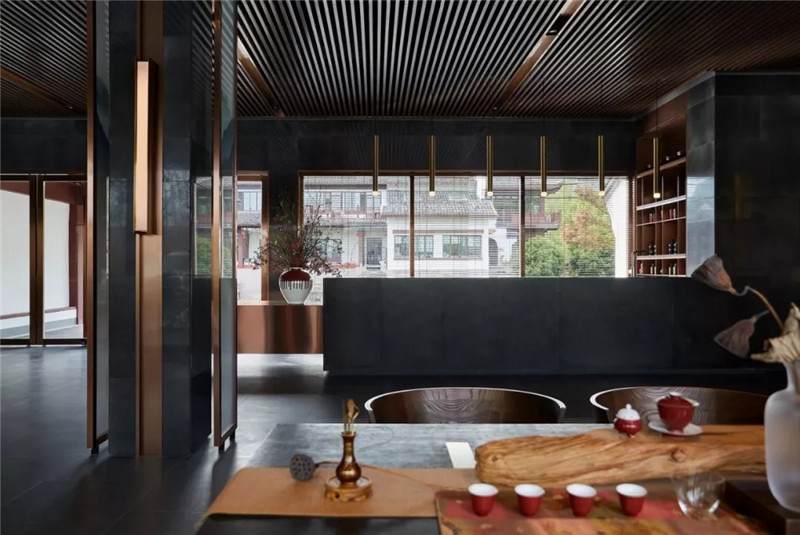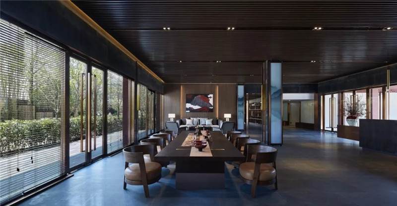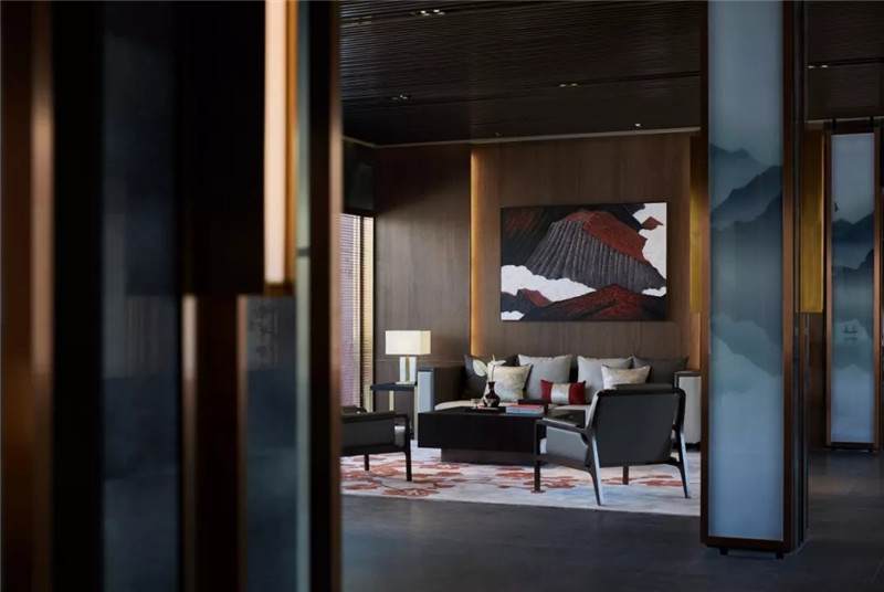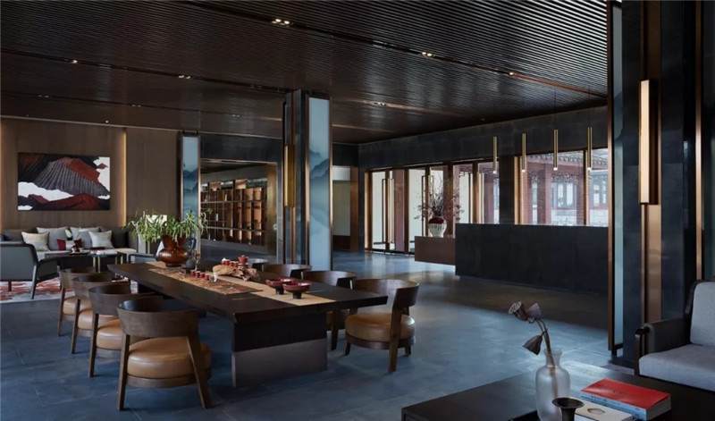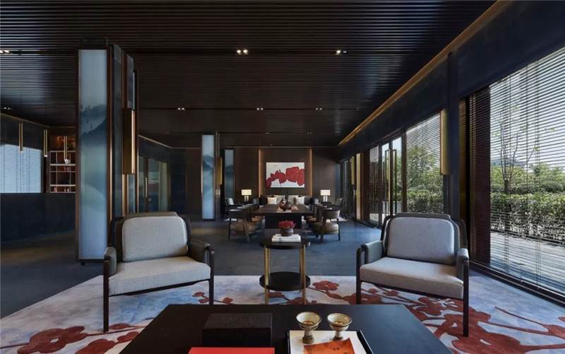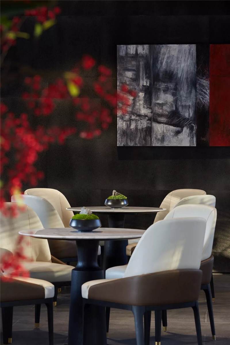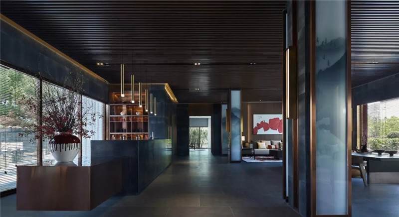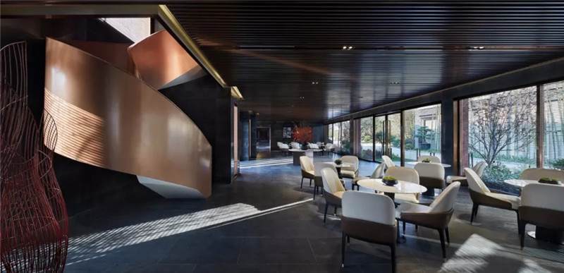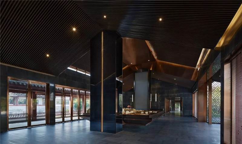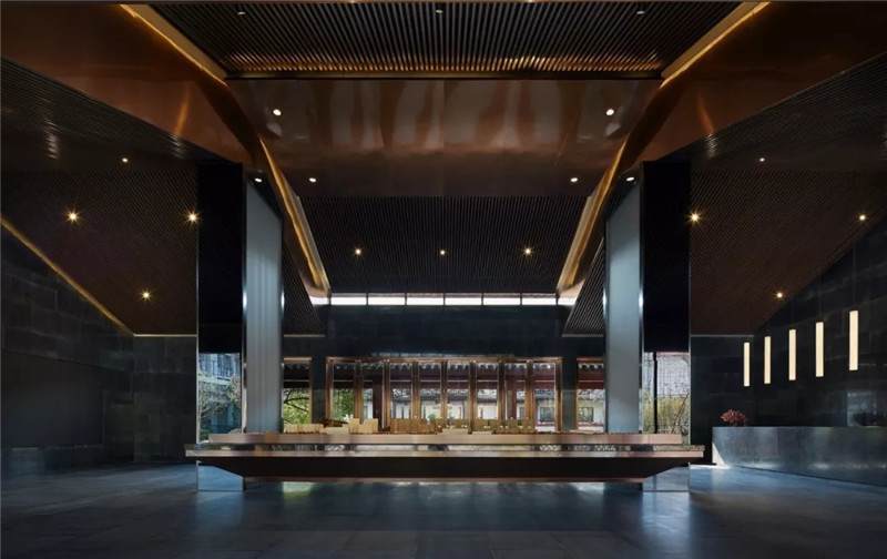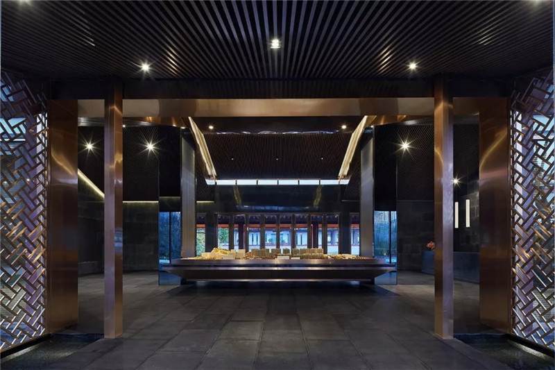 大堂內(nèi)注重材質(zhì)的克制與平衡,大面的黑色基底將儀式感與雄渾氣勢渲染而出。金屬鏤空格柵顯江南韻律,斜屋頂及頂端挑空區(qū)窗口,則是對傳統(tǒng)物態(tài)的解構(gòu)與再造。剝開視覺表象,映射出來的是現(xiàn)代、東方、藝術(shù)、自然等內(nèi)核元素,給賓客無與倫比的感官體驗(yàn)。
