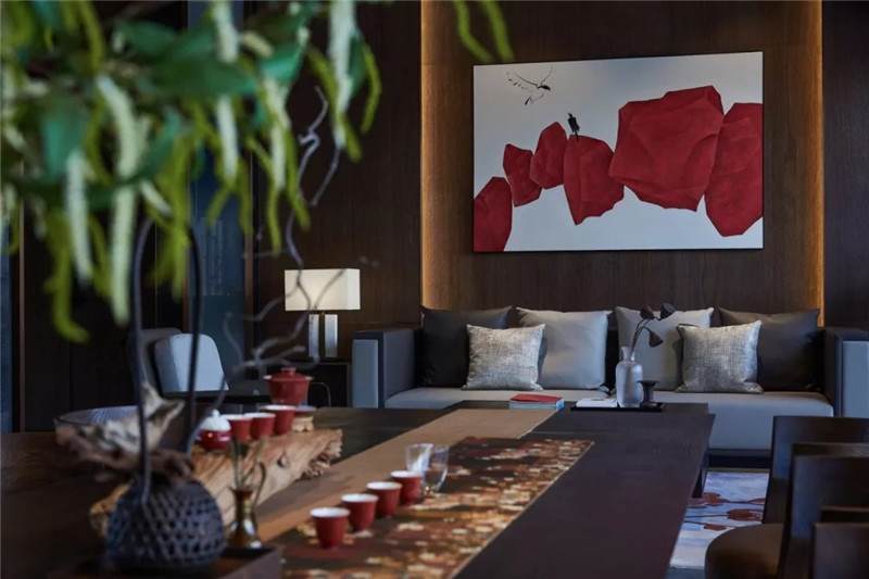 桌面借由點(diǎn)點(diǎn)紅綠添色,打破單調(diào),越發(fā)渲染生機(jī)與活力。兩端放置著極富水墨暈染狀的抽象畫作,以厚重的文化底蘊(yùn)來響應(yīng)當(dāng)下的時空與場域。