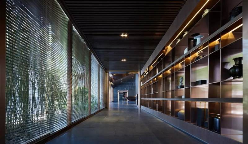 大堂西側(cè),全景落地玻璃及百葉搭配,加以園林框景手法,呈現(xiàn)意境之美、隱隱約約之效。穿回廊而過,便見洽談區(qū),頓時豁然開朗。