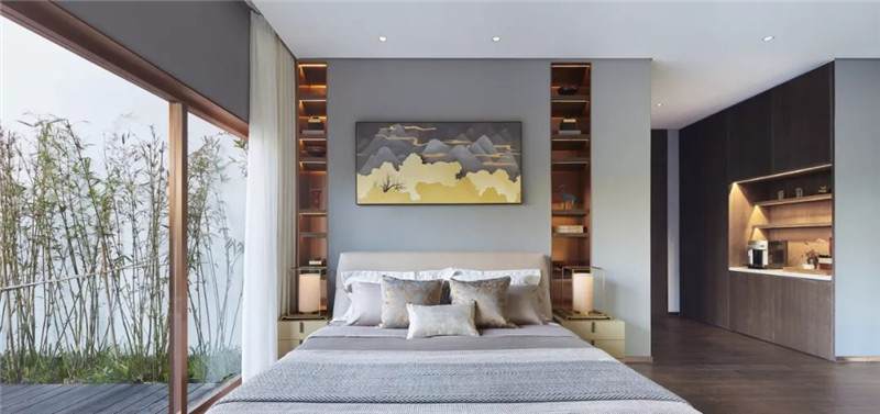 客房套間以現(xiàn)代簡約風(fēng)范融入自然,呈現(xiàn)安寧愜意之境。設(shè)計師賦予其三面環(huán)景的奢享體驗(yàn),實(shí)現(xiàn)室內(nèi)與自然的對話,物器與光影的互動。