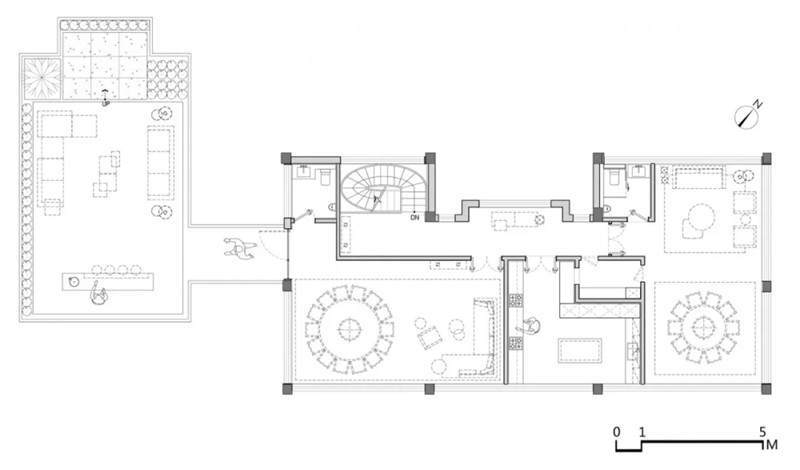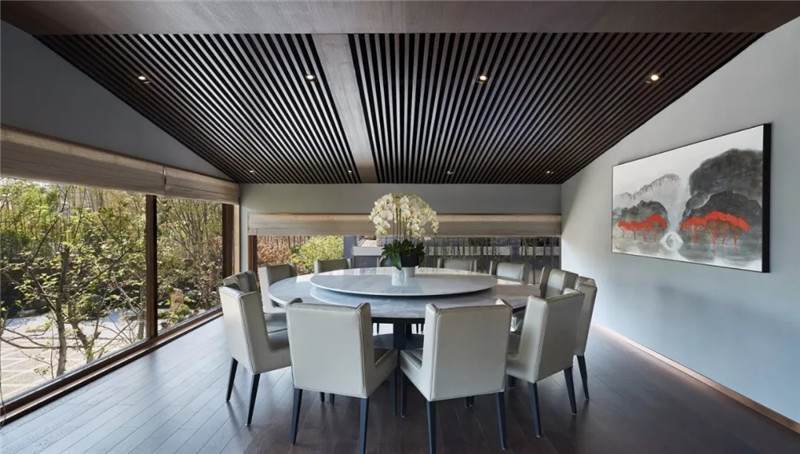 二樓設(shè)有兩間獨(dú)立包廂,供賓客攜友享用。保留古建筑原有傾斜屋頂,尊重格局而做設(shè)計,大道至簡,方圓之間,各得其妙。借由通透的落地窗引入美好景致,讓視線變得有趣,用餐更為舒適、自然。