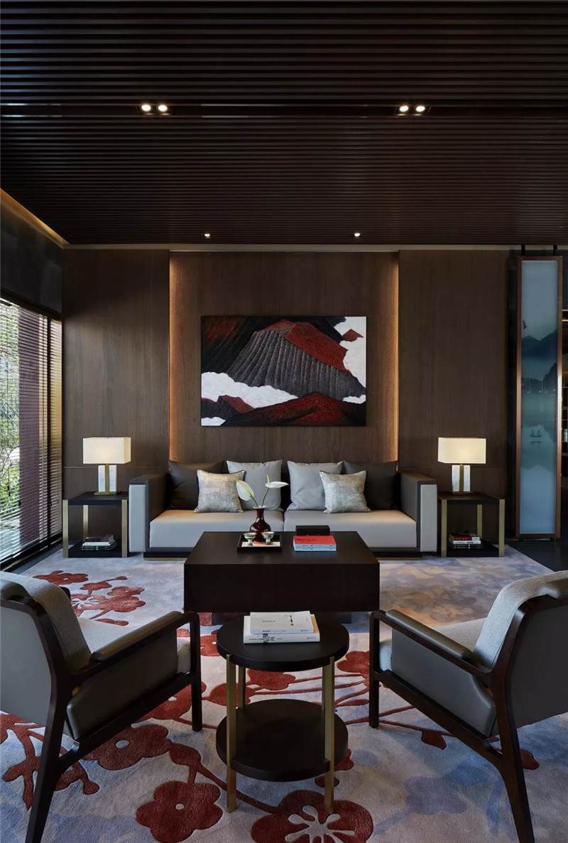 會客區(qū)處于中心茶臺兩端,對稱的手法、圍合的陳列、適宜的比例,實(shí)現(xiàn)多樣元素的碰撞演繹,剛?cè)岵?jì),飽含層次感。主背景木飾面嵌古銅,加上燈帶設(shè)置,顯得安靜而溫潤。