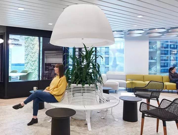 如“起居室”般的非正式會議室,則裝飾以居家般的家具營造舒適的氛圍,透過開敞的落地窗,煙波浩淼的安大略湖的美景盡收眼底,縱目四望,曠達(dá)不羈。綠色草皮般的地毯在這里隨處可見。