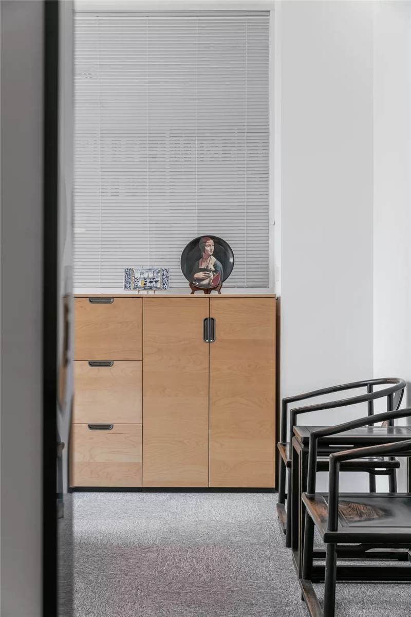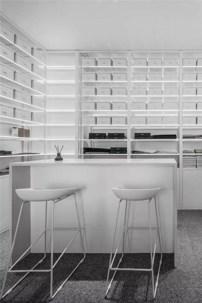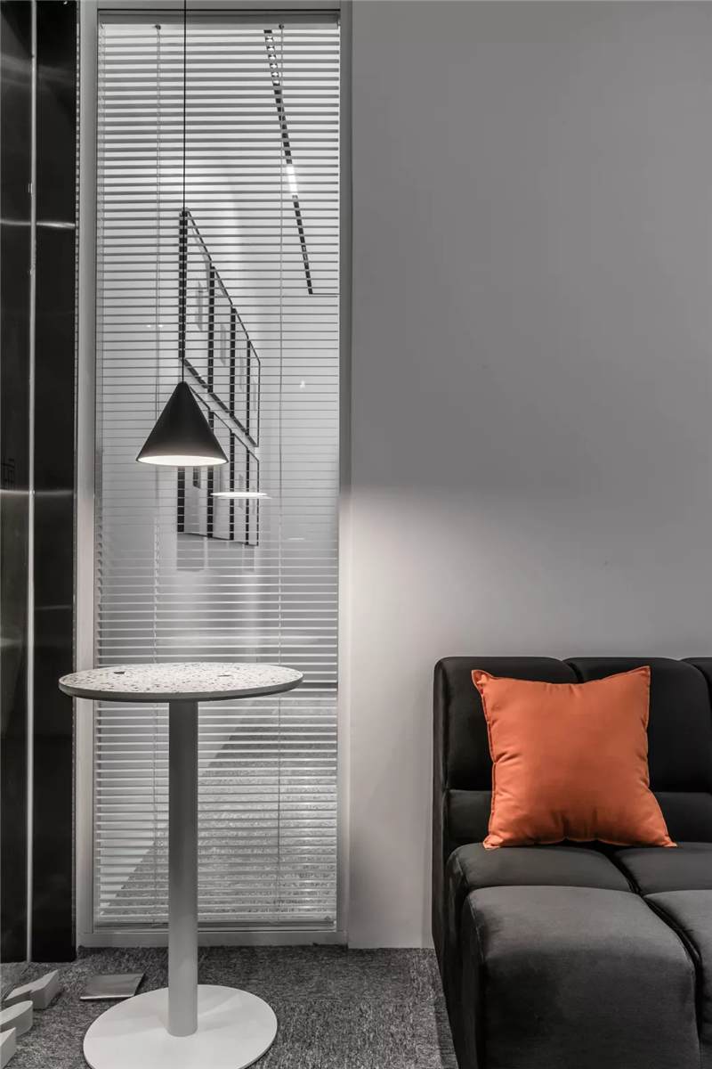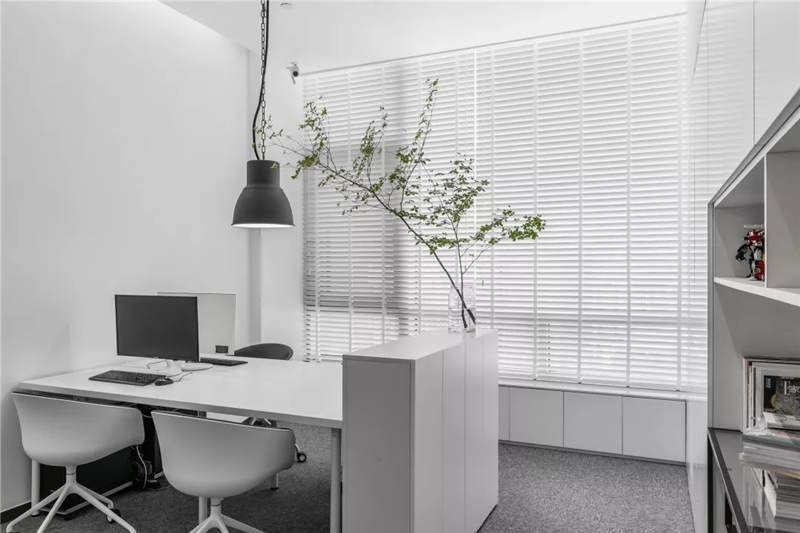 自由無拘的溝通對于團隊的創(chuàng)新至關重要。開放的辦公區(qū)是有效獲取信息和激發(fā)靈感的地方。百葉窗折射的光影,充足的自然光營造高效的工作環(huán)境??臻g雖然有限,但發(fā)揮最大的性能,開辟出一整面的軟裝材料搭配區(qū)。
