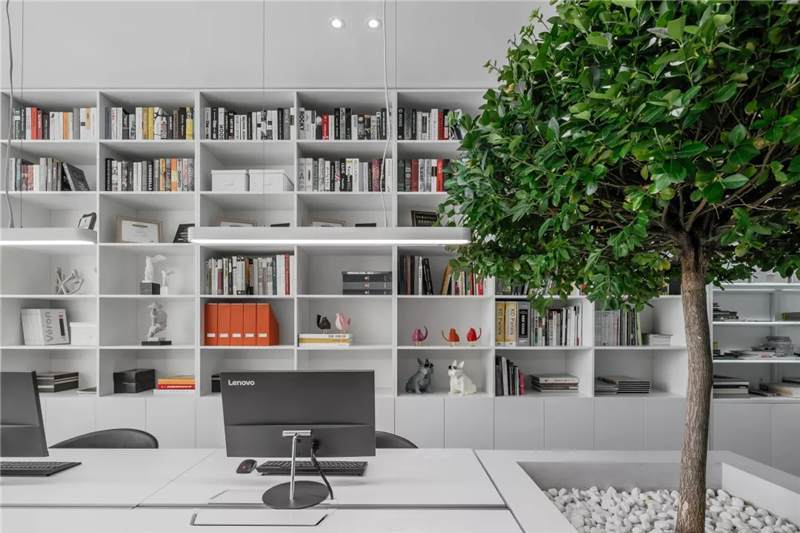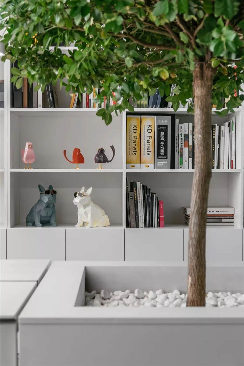 在這里,未知的一切與既有的常識記憶產生傳導,想象思維的觸角開始蔓延。小株綠樹分隔出挑高的白色高座式二人桌,提供了一種更為隨性、更利于面對面交流的辦公形式。