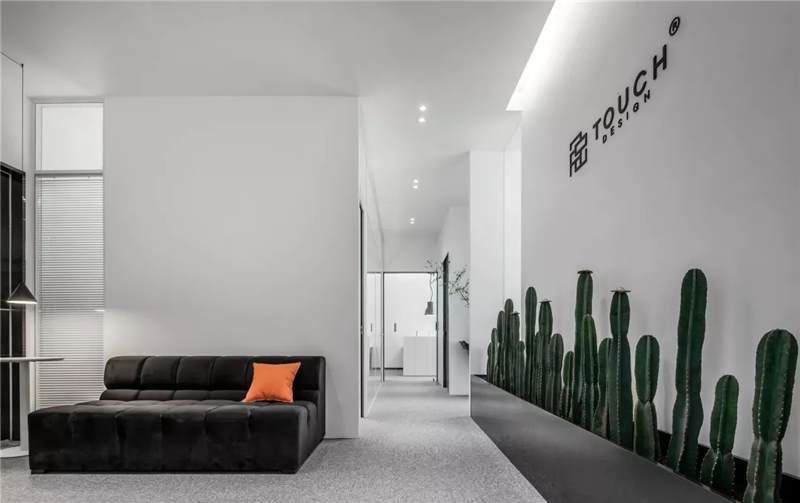 刪繁就簡,以最經典的白色為主題搭配色調,沒有繁瑣的設計和過多的裝飾,減去辦公中的壓抑感。通過將自然純凈的白色與沉靜黑色相結合,將品牌形象簡潔地呈現(xiàn)表達,同時為左右空間的過渡創(chuàng)建和諧觀感。純白的墻面,接近心靈的澄凈;仙人掌是視覺的焦點,恣意生長、堅韌、夯實根基,也正寓意著公司的設計理念:有所依、有所仗、有所長。