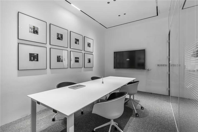 為了同時保證隱私和透明,張馳有道。會議室采用了玻璃+百葉窗的設計,這樣的交流區(qū)域保持彼此的通透與聯(lián)接,提升了場所的張力。使用貼合設計的局部掛畫藝術,配以金屬的深邃感官,多媒體影視裝置加強了墻面空間的信息輻射作用。