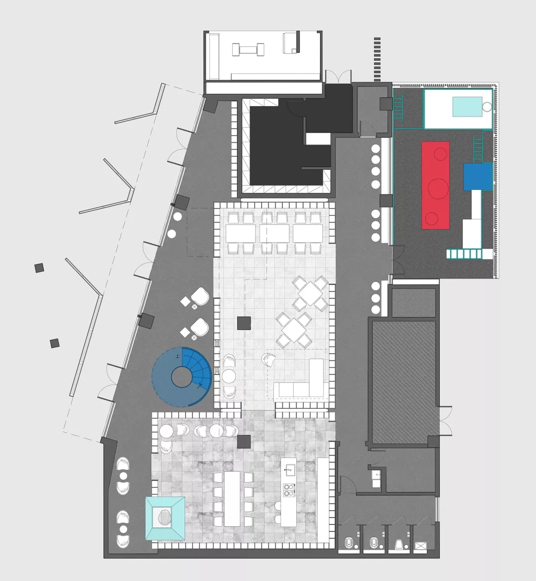 現(xiàn)場(chǎng)是個(gè)不規(guī)則的平面,如果排除未來(lái)可復(fù)制性,就著形狀設(shè)計(jì)并無(wú)不可,但這就缺乏了示范性意義。設(shè)計(jì)師按照客廳研究成果,在這個(gè)不規(guī)則平面最大極限設(shè)置了三個(gè)盒子,一個(gè)是功能性的,一個(gè)是社交性的,一個(gè)是女性的。如果把不規(guī)則的場(chǎng)地看成是一座城,這三個(gè)盒子就是內(nèi)城,而他們之間不規(guī)則的剩余空間可以自由定義的場(chǎng)所。