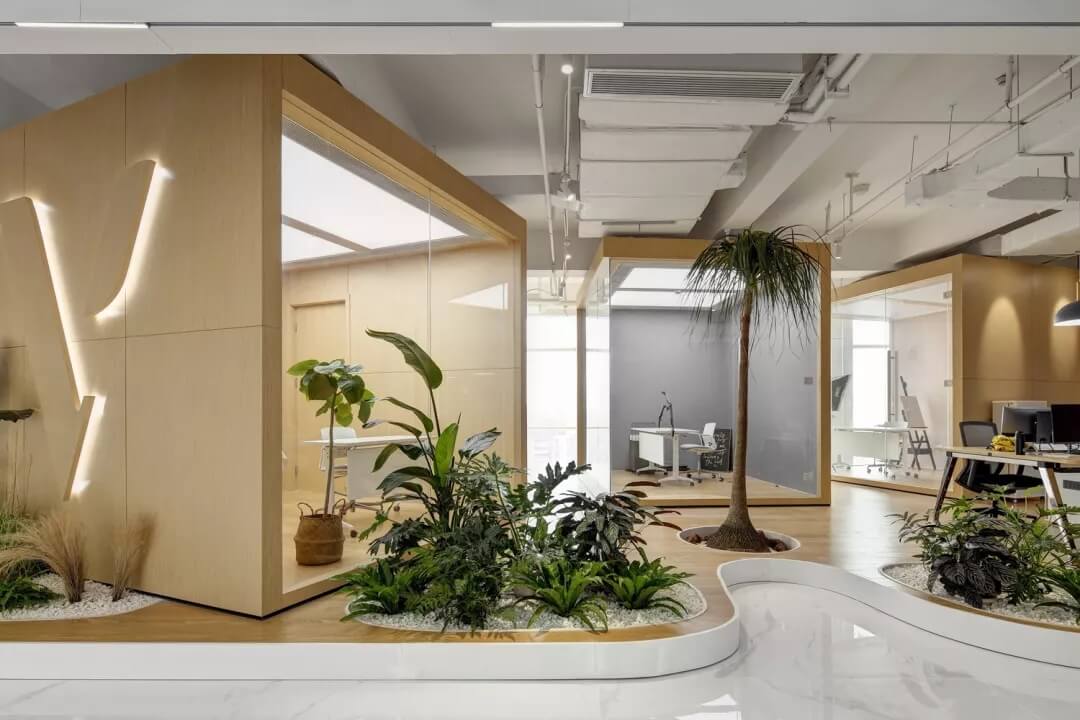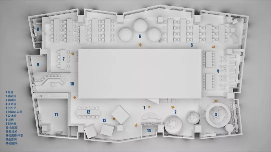 直播間在使用功能上相對獨(dú)立,且私密性較強(qiáng),由三個方形盒子組合而成,并被安置于波浪造型的臺階上,中間穿插熱帶植物進(jìn)行點(diǎn)綴,使使用者仿佛置身于椰林樹影,水清沙白的陽關(guān)海灘。在這里,不僅能夠使工作人員身心放松地完成節(jié)目的錄制工作,同時,空間的層次營造也給予觀賞者強(qiáng)有力的視覺沖擊力,將文化與藝術(shù)的融合達(dá)到了一個新高度。