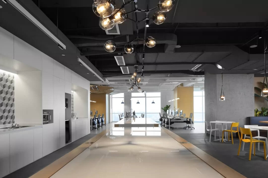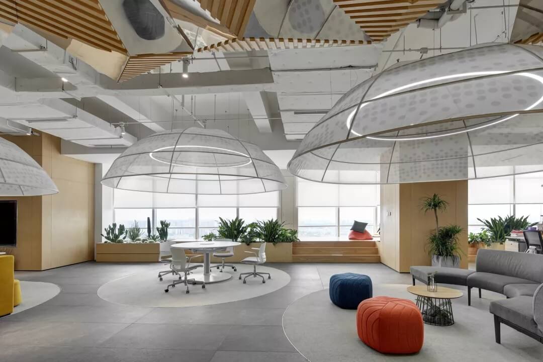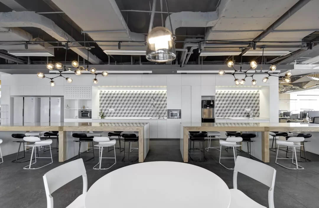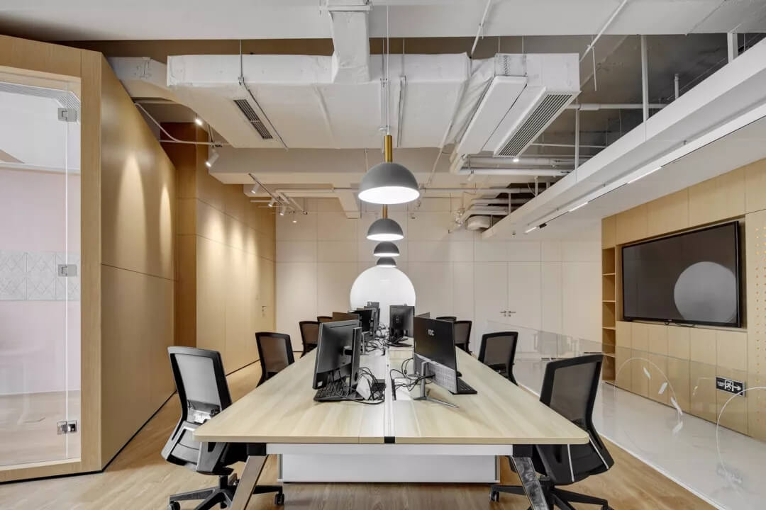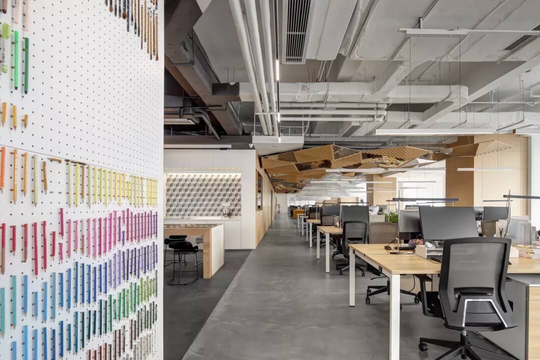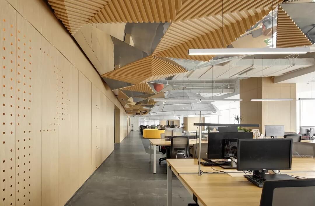 穿越員工休息區(qū),就到達(dá)了辦公室的員工工作區(qū),這里采用局部吊頂?shù)脑O(shè)計(jì),由三角形元素組合而成的“鉆石吊頂”劃分了空間頂部構(gòu)成,挑戰(zhàn)了使用者的視覺體驗(yàn),不僅豐富了辦公區(qū)域的層次,同時也增加了空間的趣味性。