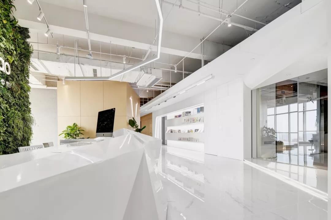 門廳接待處背景墻設(shè)計(jì)采用真實(shí)植物進(jìn)行裝飾,構(gòu)成生態(tài)的室內(nèi)空間,提升空間使用的舒適度。前臺的設(shè)計(jì)運(yùn)用體塊切割的方式做成不規(guī)則的形狀,以到達(dá)從不同的角度觀看到的場景都處于變化的狀態(tài)當(dāng)中。