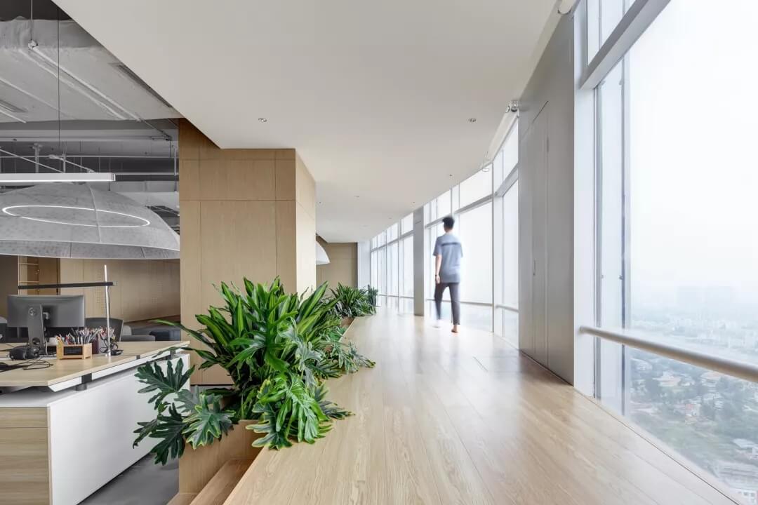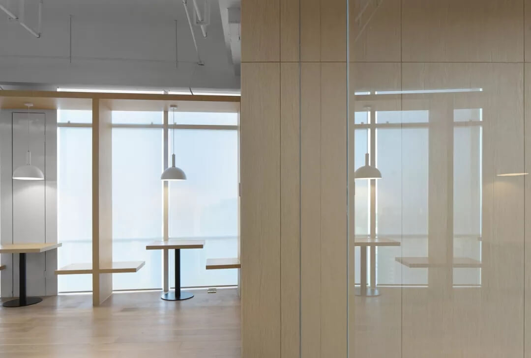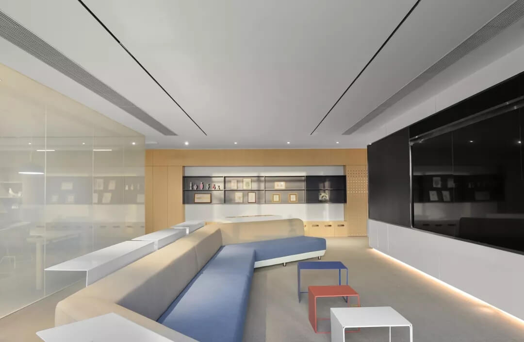 辦公區(qū)的設(shè)計(jì)打破了傳統(tǒng)辦公室嚴(yán)謹(jǐn)有序的陣列式布局方式,而在全景落地窗前設(shè)計(jì)出日式風(fēng)格的“榻榻米”造型,滿足了使用者對于空間多元化的體驗(yàn)要求,同時分隔空間,局部抬高的空間變得生動且有張力,大大提升了空間的立體感。