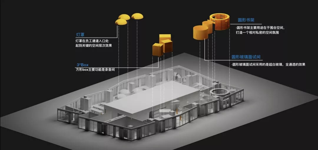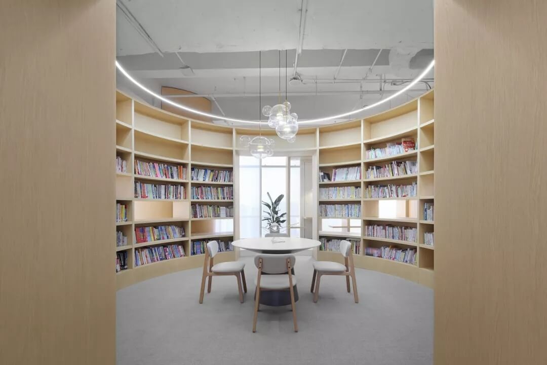 空間的劃分當(dāng)中,“圓形”起到了至關(guān)重要的作用,包括培訓(xùn)室和圖書閱覽室的設(shè)計(jì),運(yùn)用圓形圓潤的特質(zhì),柔和的將空間劃分,從而使空間的運(yùn)用上富有彈性,動線的流通更加靈活。位于西北角的圖書閱覽室,是整個室內(nèi)空間體量最大的一部分,同時也是此次設(shè)計(jì)亮點(diǎn)之一,它可放大約3000本書籍。
