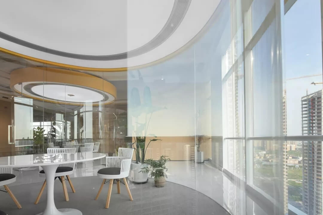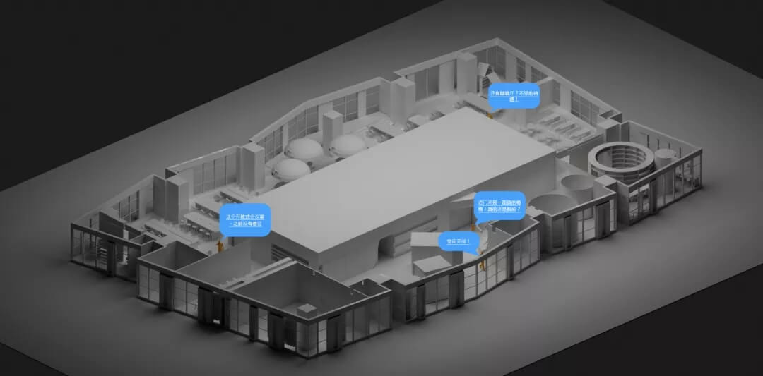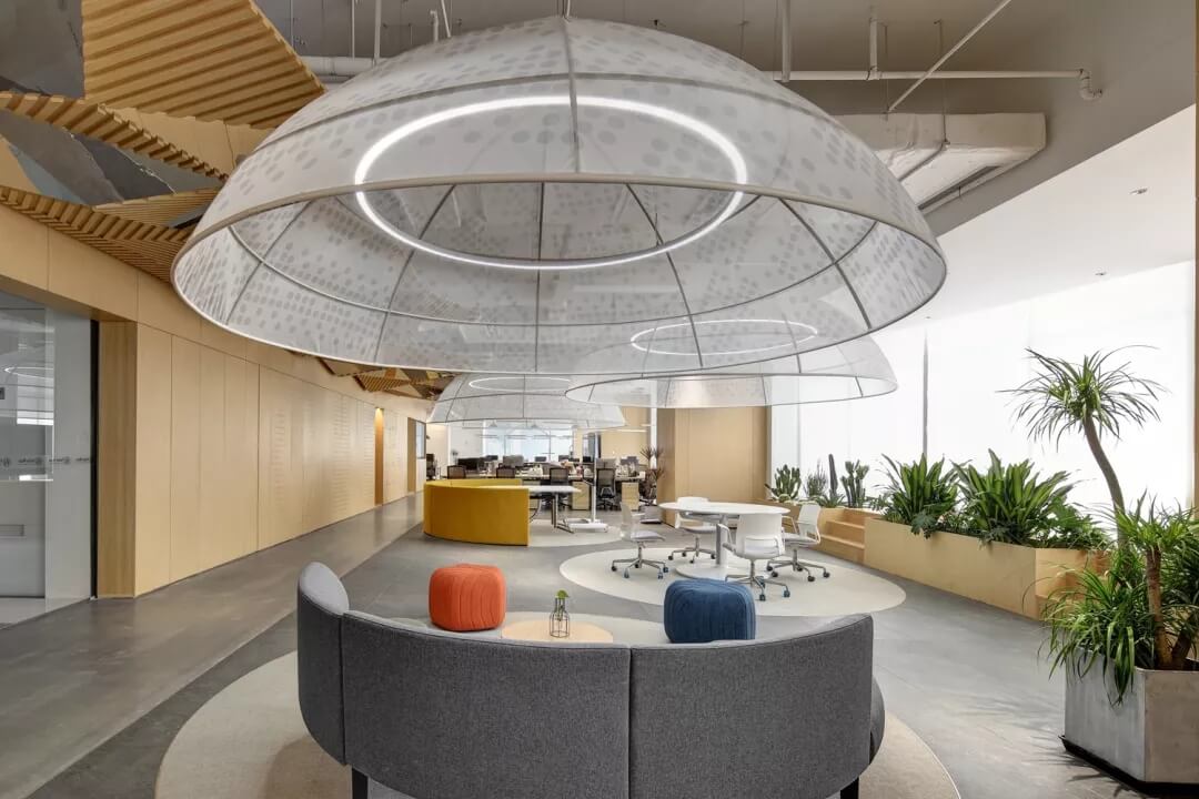 活動辦公區(qū)的圓頂造型再次運(yùn)用了“圓形”元素,使得空間首尾呼應(yīng)。圓形的劃分使大面積的接待區(qū)在使用上更加靈活,網(wǎng)紗狀燈罩的設(shè)計(jì)增加了空間視覺上的朦朧感,使空間的使用更具舒適性。