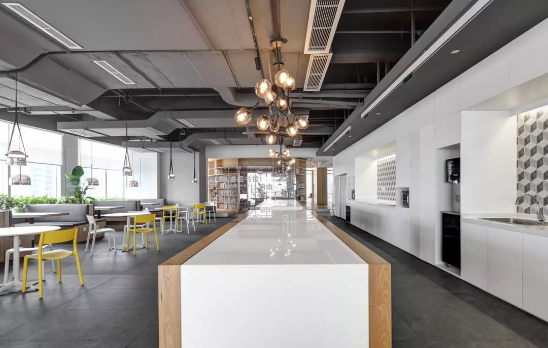 茶水區(qū),同時也是為員工準(zhǔn)備的小型餐廳,水泥質(zhì)感的休閑餐飲空間更加穩(wěn)重大方,吧臺的設(shè)計(jì)可為員工提供輕食的烹飪,以及簡食的加熱。