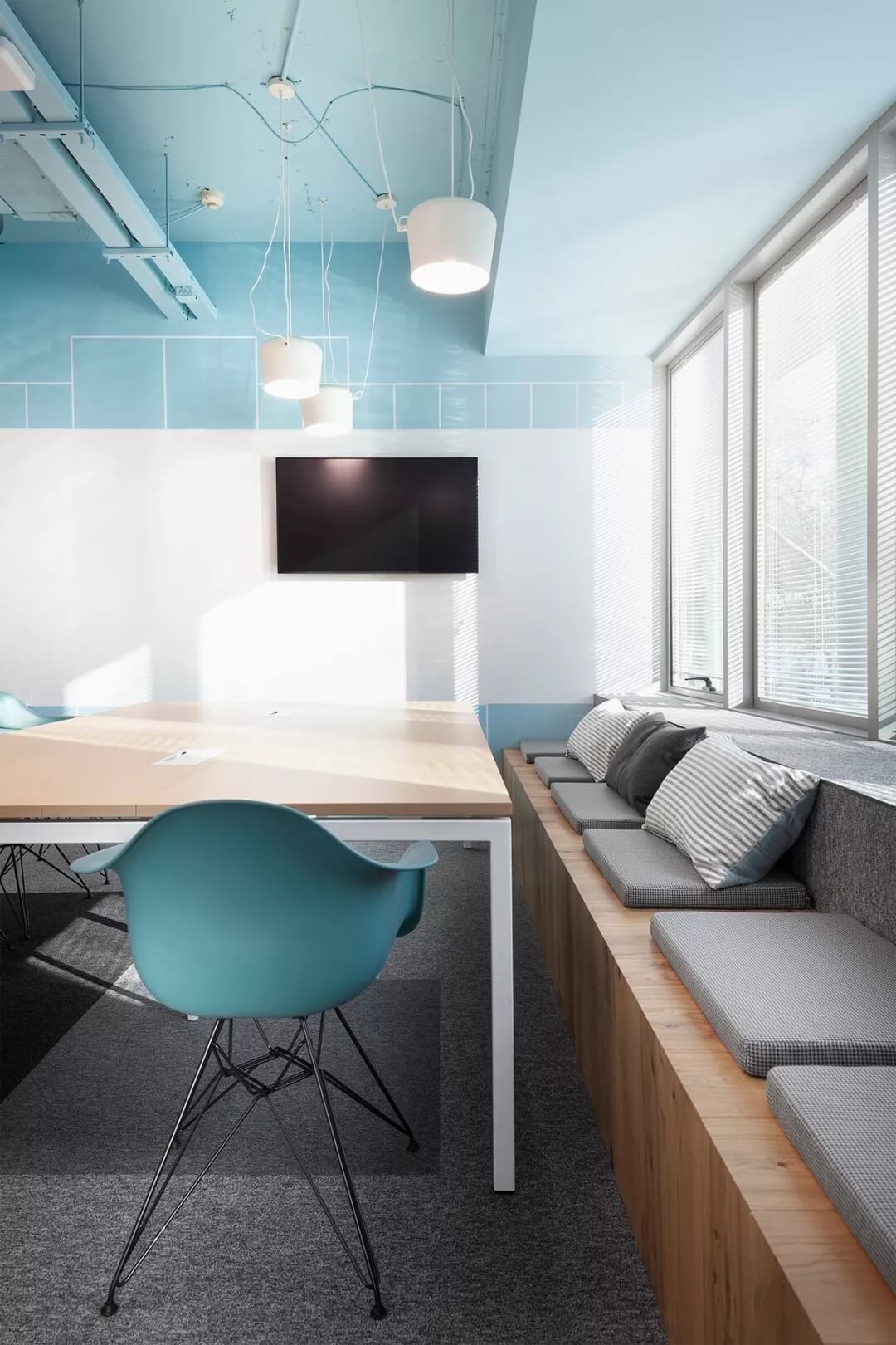 “位于保加利亞三層樓的新金融時報辦公樓,是首都索非亞最負盛名的地區(qū)。當Cache atelier的建筑師受委托設(shè)計FT的新創(chuàng)意空間時,他們想創(chuàng)造一個年輕的靈魂空間,但又不失平靜輕松的舒適感。
