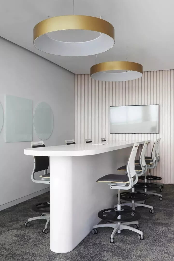 計(jì)概念的靈感來源于公司的名稱——L'or(法語,意為gold金色)和aurele(法語,意為halo光環(huán))。“金色光環(huán)”的品牌寓意成為整個(gè)空間形式的構(gòu)造背景,整個(gè)辦公室的主動線也圍繞著一個(gè)圓環(huán)來規(guī)劃。這個(gè)中心圓環(huán)被定義為一個(gè)明亮的核心空間,形成一個(gè)中心會議大廳,周邊分布著或開放或封閉的會議區(qū)。