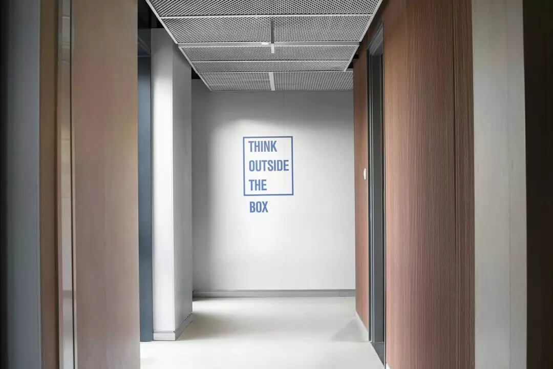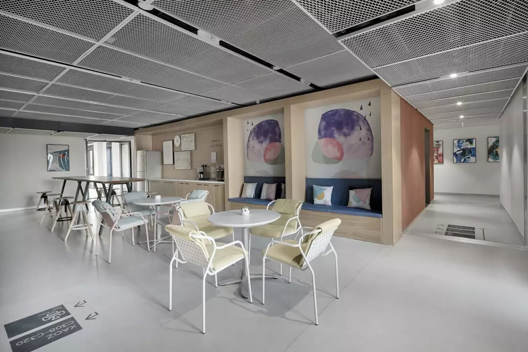 至于盒子以外的空間,我們想凝聚更多的人文藝術(shù)氣息,選擇較多地去鋪陳展示各種抽象的藝術(shù)線條和畫作,同時(shí)為了不失去生活氣息,各個(gè)角落選擇顏色比較跳躍的家居什物,讓它作為一個(gè)流動(dòng)的戶外廣場(chǎng),讓人可以自在穿行其中,偶爾停駐觀察,經(jīng)得住人聲鼎沸的喧擾,亦能提供心靈靜憩的安寧。在這里,大家認(rèn)真辦公、生活、盡情交流、分享,它就是一個(gè)安放綠意,有極高包容度的公共空間。