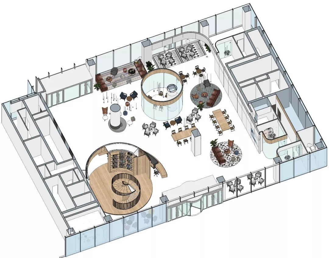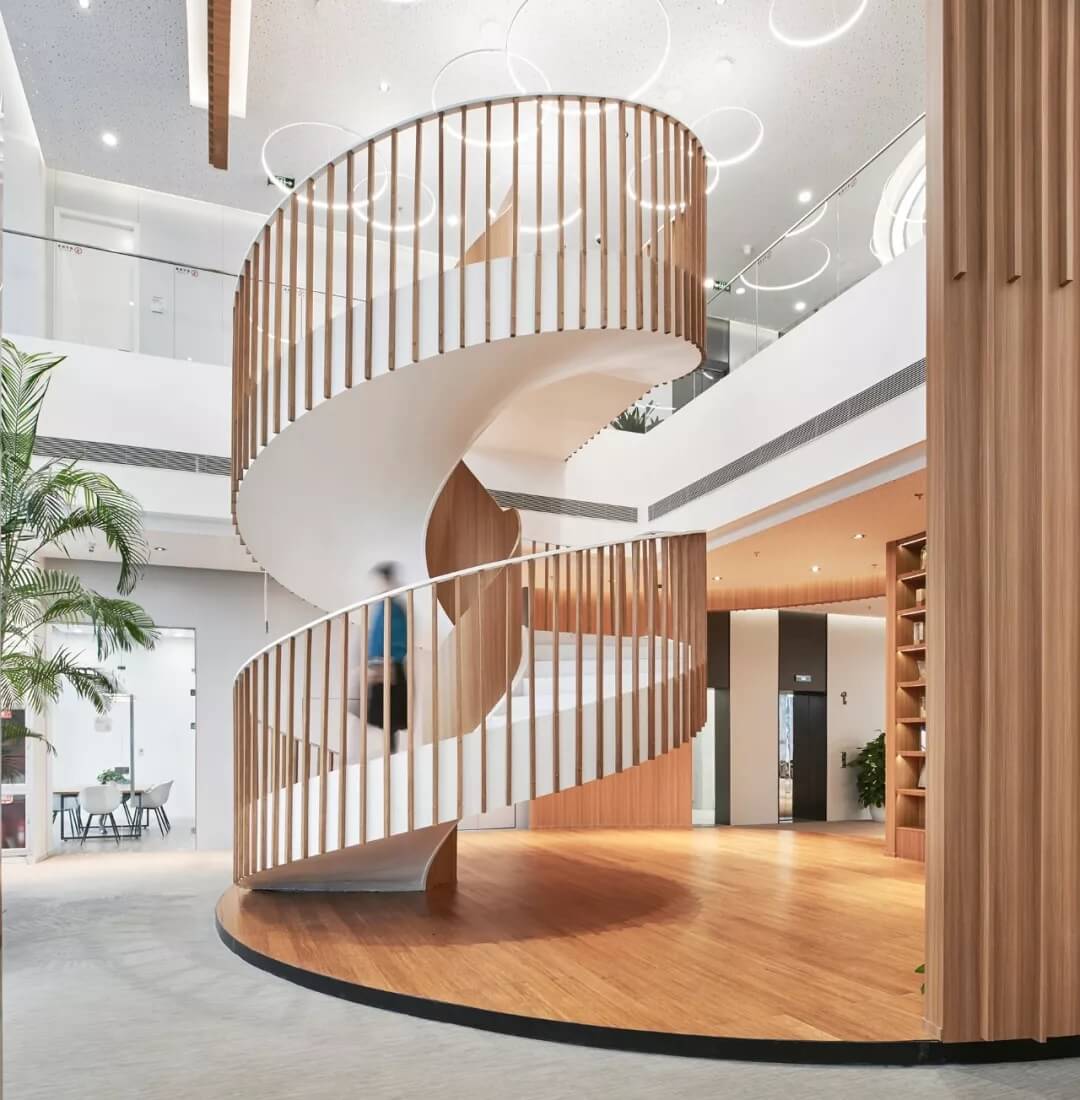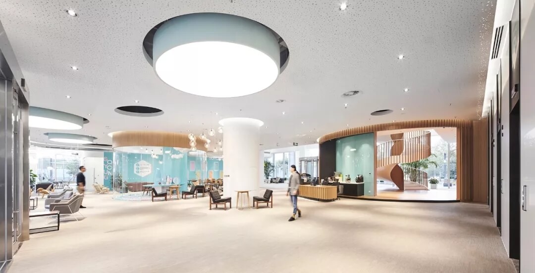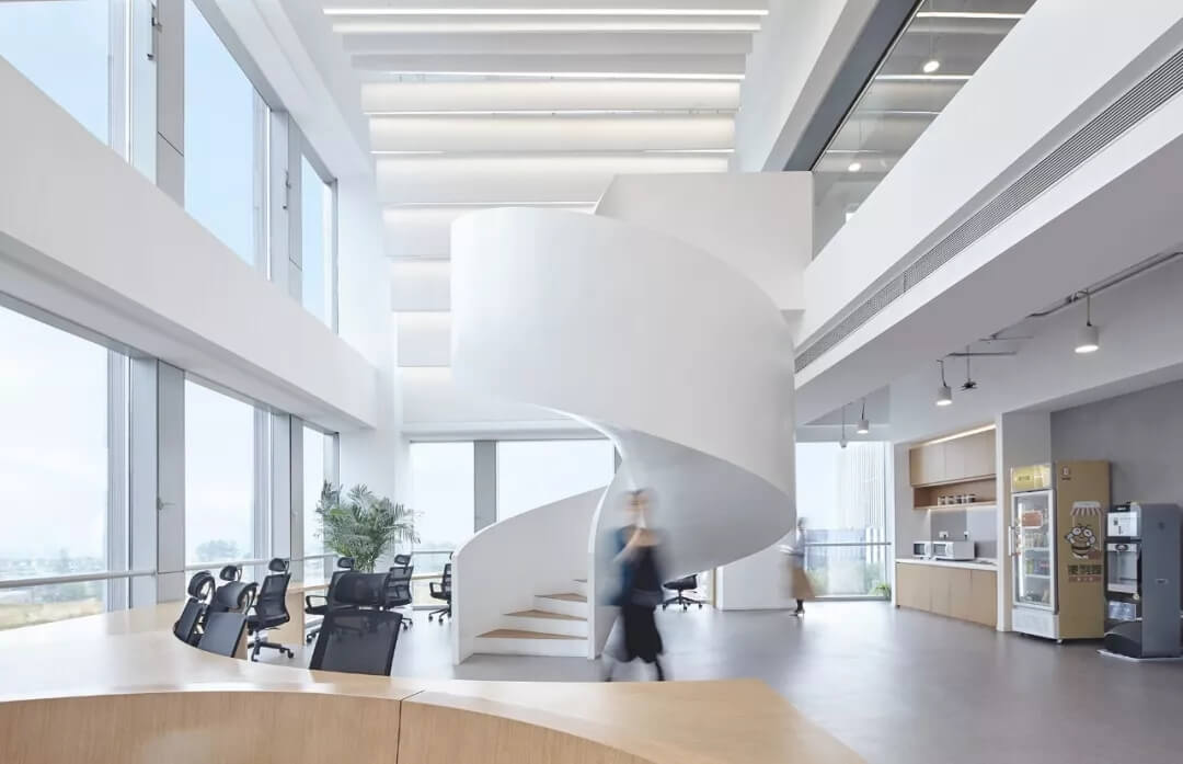 都市客廳島,選擇流暢線條的螺旋樓梯貫穿上下,運(yùn)用條形面板錯(cuò)縫排列成弧形的照明方式,使整個(gè)空間照度均勻,且條形面板亦可作為裝飾展示面。家居軟裝選用極簡(jiǎn)風(fēng)格,流線組擺方式,營造自由靈活的空間,促進(jìn)員工間的交流和溝通。