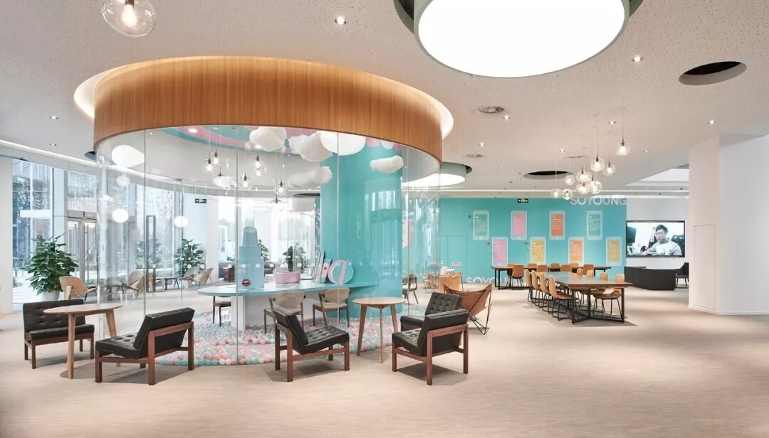美麗生活館,開拓了新的辦公空間接待區(qū)域使用模式,它融合新氧接待,面試,對(duì)外文化展示,咖啡社交等多元化功能,不僅僅是新氧人的前廳,更是對(duì)外開放,接納周邊其他企業(yè)及社會(huì)人員在此休憩,商務(wù)洽談的公共空間,充分彰顯了新氧開放包容,活力自信的社交屬性。