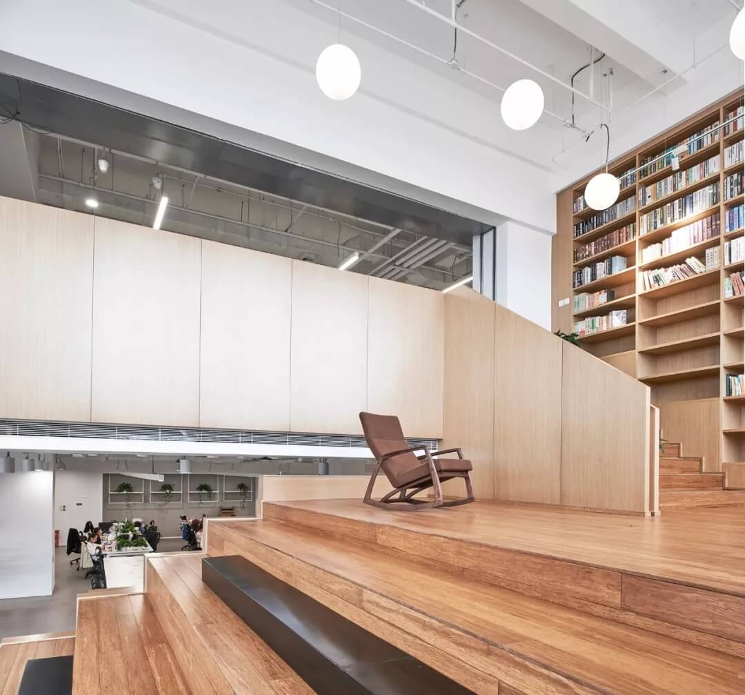 美不止于外在,更追求內(nèi)心。8-9層是新氧心靈之約—圖書閱讀區(qū)。木飾面板大樓梯,高懸掛的裝飾燈,營造出安靜舒適的閱讀氛圍,同時(shí)也可以作為小型沙龍或讀書分享活動(dòng)場(chǎng)所。