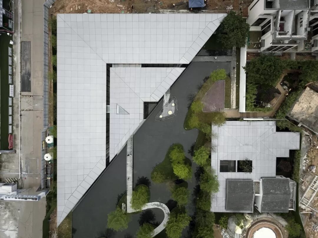 同時,整個建筑運用了現(xiàn)代構(gòu)圖的方式,突破了傳統(tǒng)對稱的客家建筑特征,將多個同心半圓演化成多個相似三角形,構(gòu)成了不對稱的幾何空間;巧妙地通過線與面的緩急對比加強(qiáng)了視覺上的層次感,以不同的設(shè)計手法,在保持建筑與外部交匯貫通的關(guān)系的同時,強(qiáng)化了建筑的縱深感。