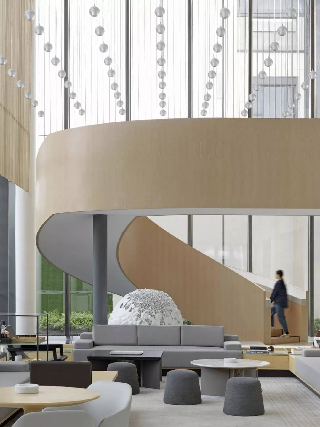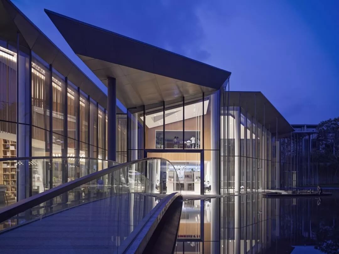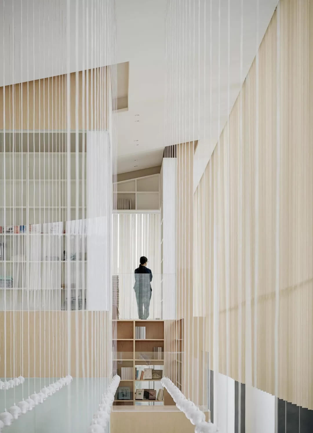 懸挑的頂棚引導(dǎo)游客進(jìn)入建筑內(nèi)部,映入眼簾的是錯落分布著木質(zhì)懸浮盒子的雙層十米挑高空間。同時大面積的玻璃幕墻營造的通透感,使得無論哪個方位,都具有內(nèi)外空間相通的視覺體驗。隱藏在水池中的下沉休息區(qū),懸掛在天花上的木隔柵,穿插在旋轉(zhuǎn)樓梯和書架之間的休閑洽談區(qū),還有較為隱蔽私密的二層貴賓室,多個不同功能的空間仿佛彼此獨立,卻又渾然一體。