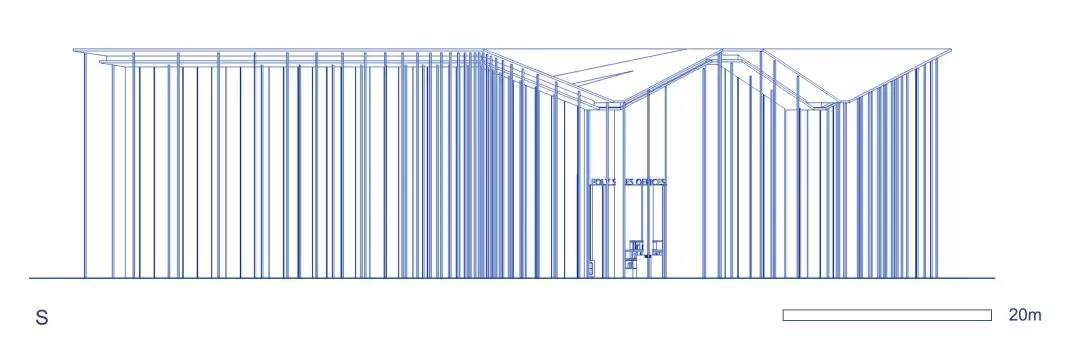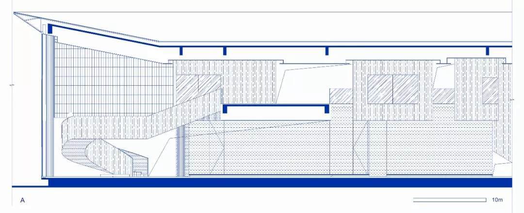 為了適應(yīng)當(dāng)?shù)貧夂?,建筑師在南翼雙層通高的開敞空間內(nèi)設(shè)置了懸垂的木隔柵,可以達(dá)到舒適的遮陽效果,并且具有空間劃分的功能。公共洽談區(qū),雙層書架,咖啡吧就位于此。平行垂落且錯落的木隔柵打破了安靜的空間氛圍,和室外的廊柱相互呼應(yīng)的同時,密布的木隔柵也自身形成體量與二層的功能體塊虛實相生。