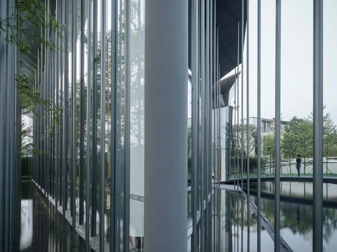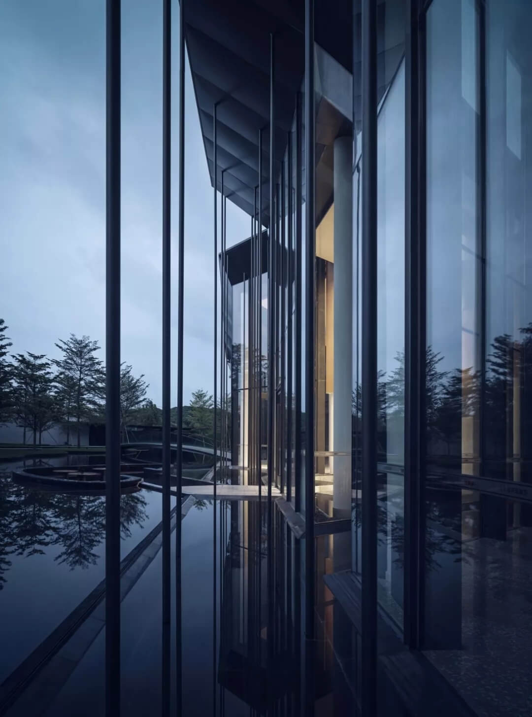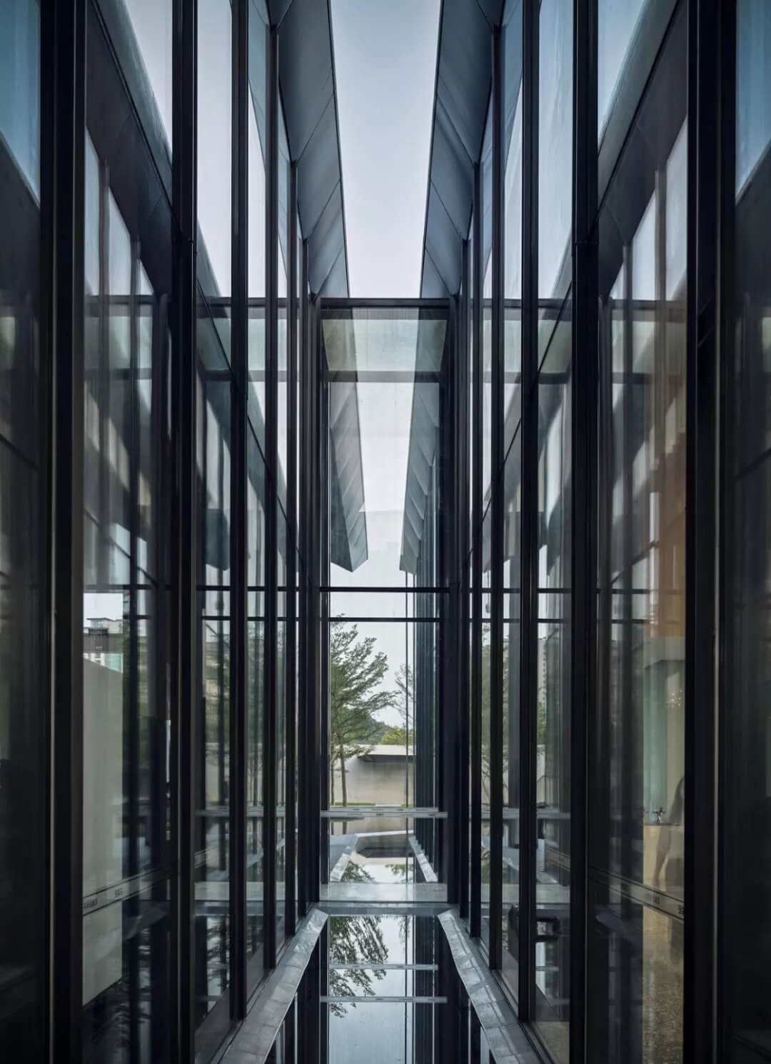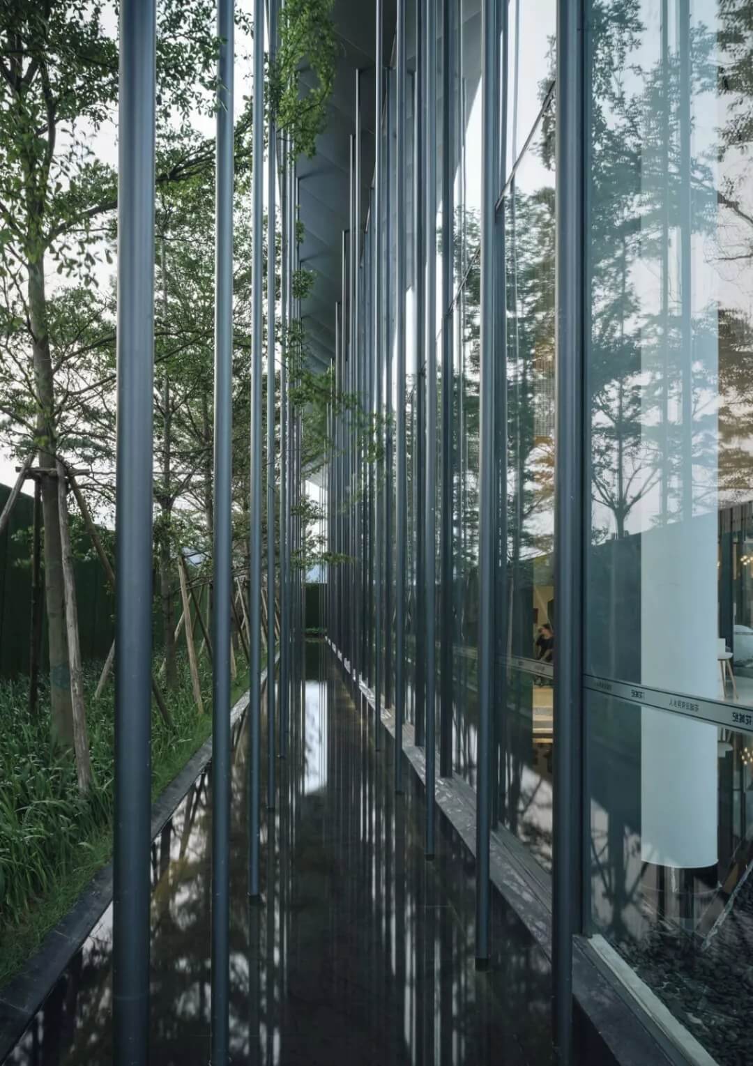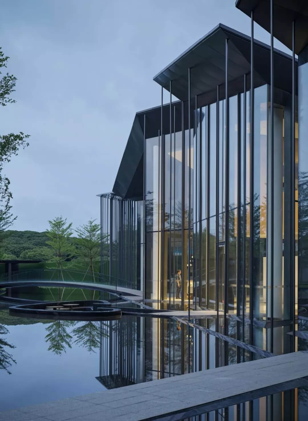 在這個項目中,建筑師嘗試用現(xiàn)代的理念、結(jié)構(gòu)和材料來打造由封閉走向開放融合的客家建筑,創(chuàng)造出傳統(tǒng)文化和現(xiàn)代觀念相結(jié)合的建筑形態(tài)。如同客家建筑大多坐落于山水樹林間,這座雙層建筑與周圍自然景觀也保持著親密聯(lián)系。剪影式的三角形頂棚如同山的影子般遮蓋著地面;而支撐著整個三角屋頂?shù)慕饘僦韧鹑裘艿臉淞?,與戶外的樹木連成一片;環(huán)繞場地的水景弱化了由剛性的幾何平面帶來的疏離感,大面積的玻璃的應(yīng)用,引入周圍綠色景觀,重新定義了建筑與周邊的環(huán)境關(guān)系。莊重但不厚重的頂棚,高聳錯落的柱廊,通透的落地玻璃,山與樹與水。