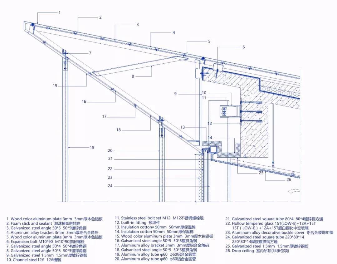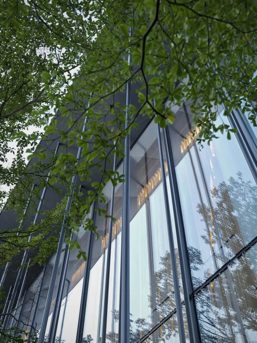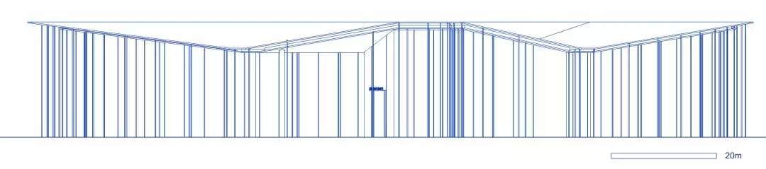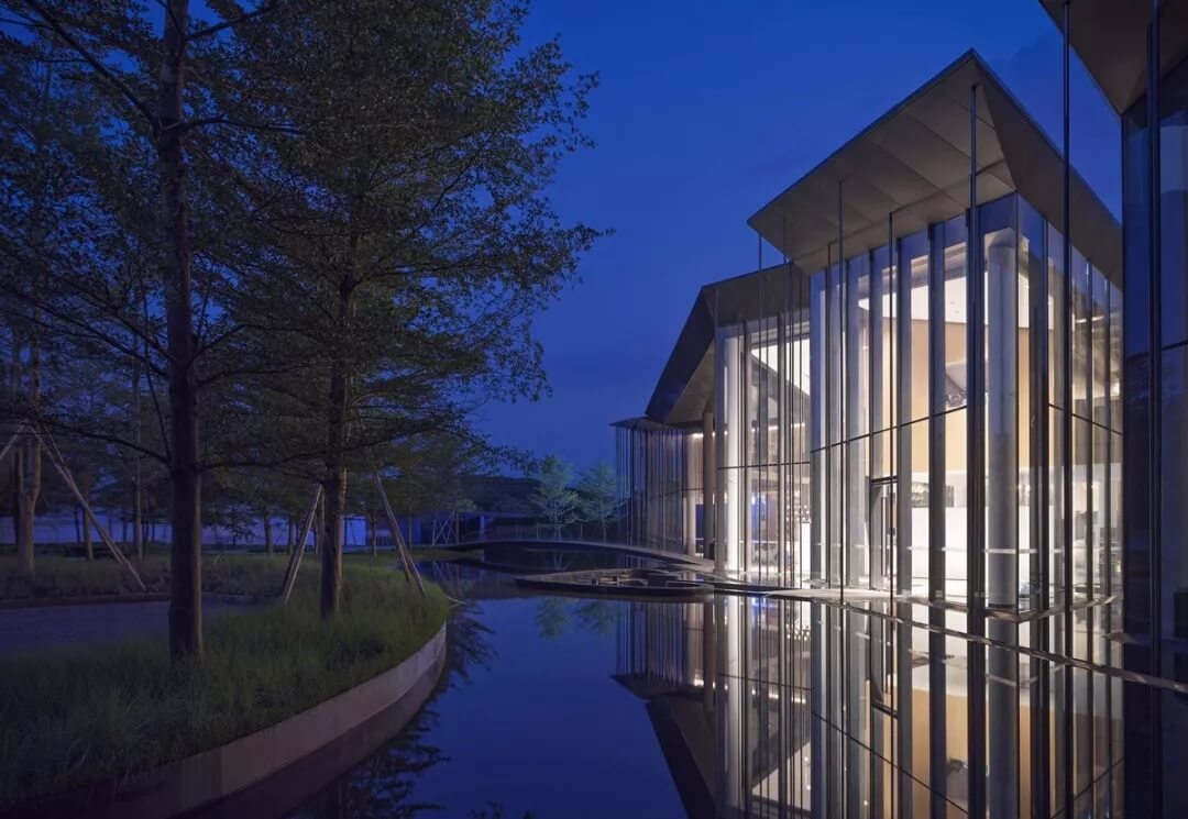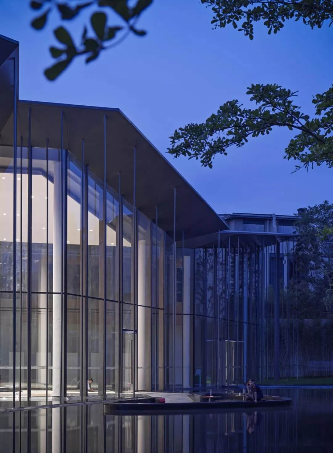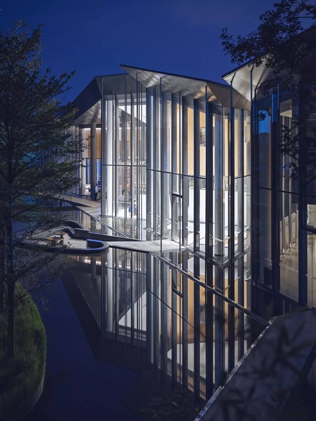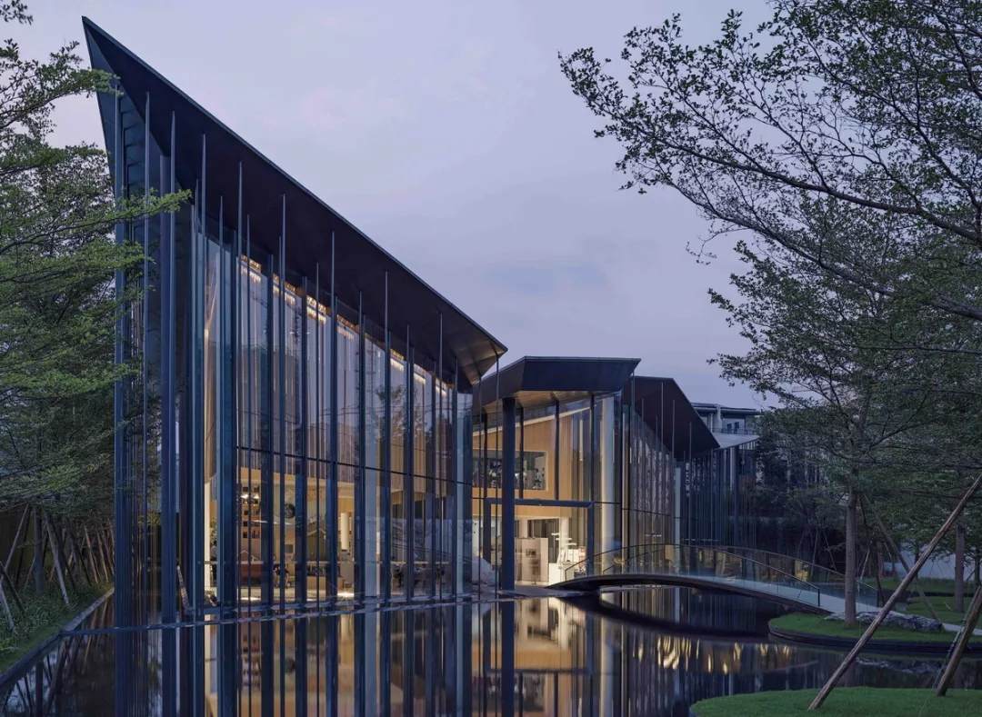 在這個項目中,建筑師嘗試用現(xiàn)代的理念、結(jié)構(gòu)和材料來打造由封閉走向開放融合的客家建筑,創(chuàng)造出傳統(tǒng)文化和現(xiàn)代觀念相結(jié)合的建筑形態(tài)。如同客家建筑大多坐落于山水樹林間,這座雙層建筑與周圍自然景觀也保持著親密聯(lián)系。剪影式的三角形頂棚如同山的影子般遮蓋著地面;而支撐著整個三角屋頂?shù)慕饘僦韧鹑裘艿臉淞?,與戶外的樹木連成一片;環(huán)繞場地的水景弱化了由剛性的幾何平面帶來的疏離感,大面積的玻璃的應(yīng)用,引入周圍綠色景觀,重新定義了建筑與周邊的環(huán)境關(guān)系。莊重但不厚重的頂棚,高聳錯落的柱廊,通透的落地玻璃,山與樹與水。