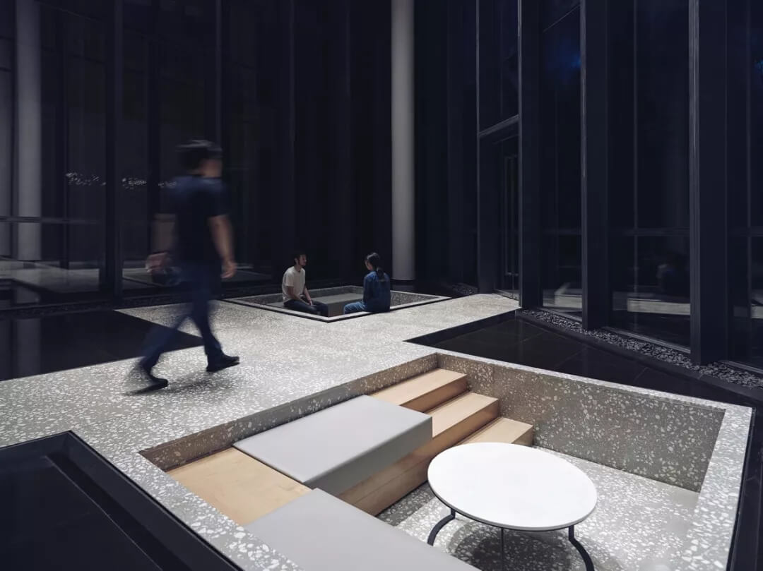 下沉式休息區(qū)由外部滲透進(jìn)來的水體環(huán)繞包圍,似客家建筑中的天井,收集儲蓄疏通雨水,淺水鏡面不僅倒映出光影的變化,也將窗外的枝繁葉茂引入室內(nèi),營造出人與自然融于一體的環(huán)境。