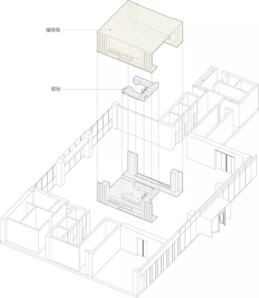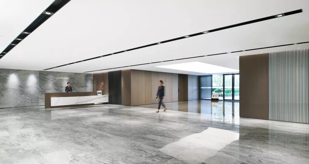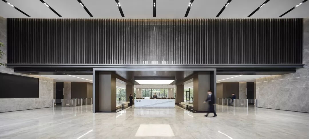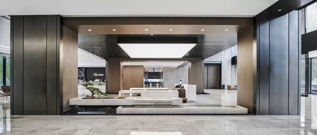 設(shè)計(jì)師通過空間布局,材料選用等營(yíng)造出大堂沉靜務(wù)實(shí)、理性的空間氛圍,咖啡,水聲,盆景,窗外的花園,以及往來的員工,客戶和行人賦予這里靈魂和氣息,使整個(gè)大堂充滿各種可能性。
