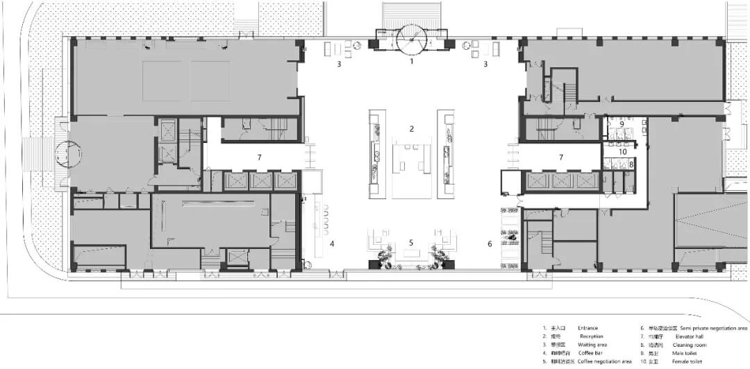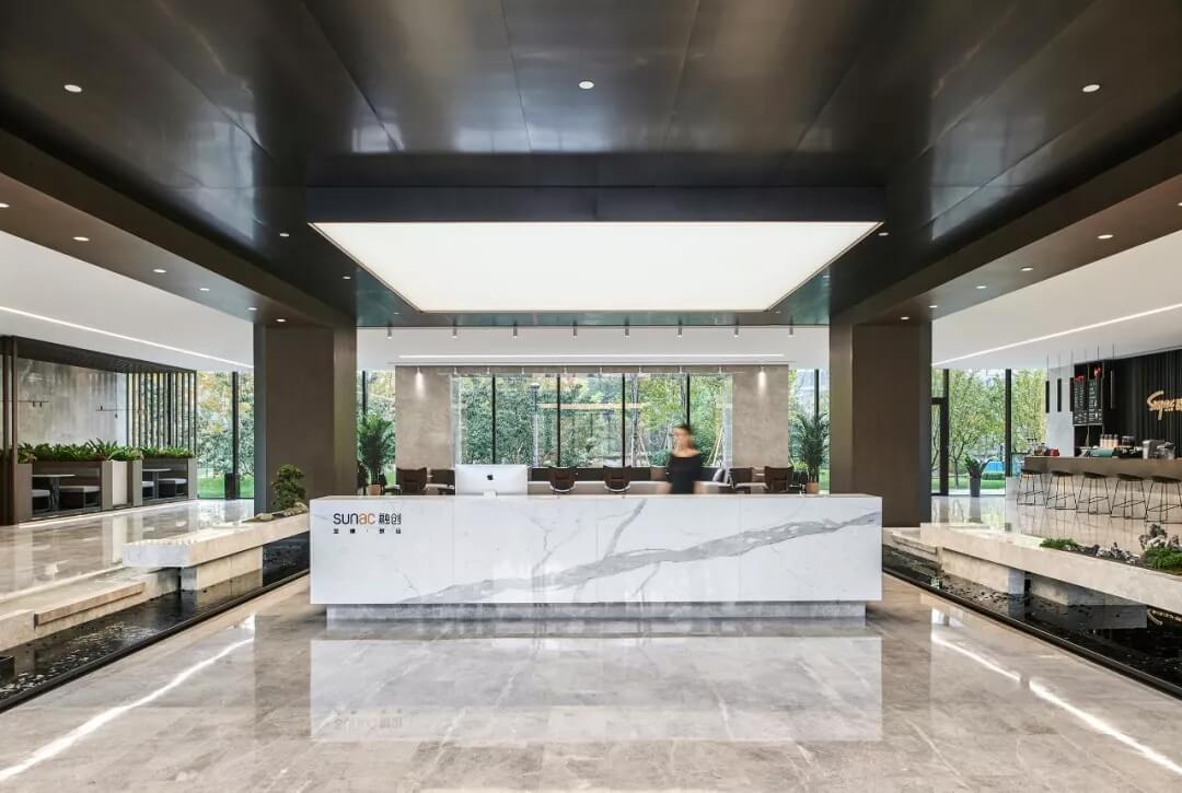 大堂是開放,通透,自然的園林式空間,自成一片天地。踏入大堂即可看到前廳接待島,方形四面通透的造型,嚴(yán)謹(jǐn)不失靈活,結(jié)合流動(dòng)水景和盆景,營(yíng)造了生態(tài)的,四季怡情的綠色辦公。電梯廳出入口在接待島兩側(cè),實(shí)現(xiàn)快速集散,避免上下班高峰期等候擁堵??Х鹊群騾^(qū)玻璃窗形成框景,把室外花園內(nèi)的四季變幻,自然元素都納入到室內(nèi)來,形成情景共融。