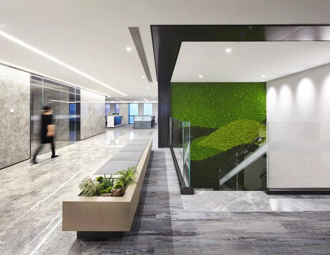 八層原場(chǎng)地建筑南側(cè)是一座覆土花園平臺(tái),出電梯廳南側(cè)是簡(jiǎn)潔寬敞的接待廳,空中花園相對(duì)的兩側(cè)分別布局兩間辦公室,為了使戶外的自然元素與室內(nèi)連接,設(shè)計(jì)師把朝花園一側(cè)建筑幕墻改為大推拉玻璃移門,使視野更開闊,花園盡收眼底,也可隨時(shí)出入體驗(yàn),加強(qiáng)了與自然的聯(lián)系。