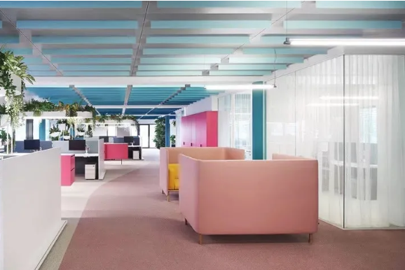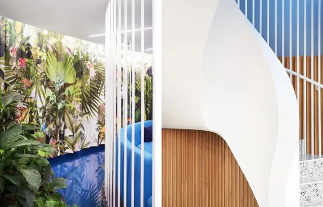 工作區(qū)采用中性色設(shè)計,利于專注工作。淡粉色的走道是真正的情緒助推器,它喚起了員工之間的情感共鳴。精心布置的水源和雅致的燈光設(shè)計有助于帶來更愉悅的心情。熱帶壁紙與柔軟的沙發(fā)和小圓桌塑造了一個熱情洋溢的活力氛圍。
