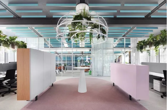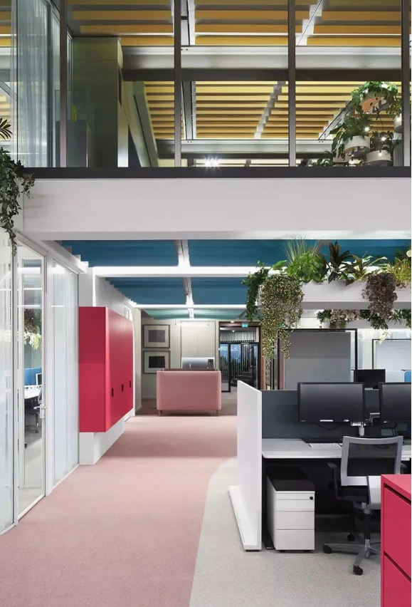 首先,設(shè)計團隊為這處工作場所增添了2100個超級盆栽植物。綠植能產(chǎn)生良好的情緒、降低精神壓力、促進(jìn)創(chuàng)新、提高績效。此外,綠植還能改善空氣質(zhì)量、營造健康環(huán)境,并起到降噪的作用。它們只需定期澆水就能保持茂盛狀態(tài),因此深得人心。室內(nèi)盆栽植物具有強大的正能量。自從加入了這些綠化,室內(nèi)濕度不僅從18%增加到44%,讓人們的體感非常舒適,連員工的病假都減少了一半!